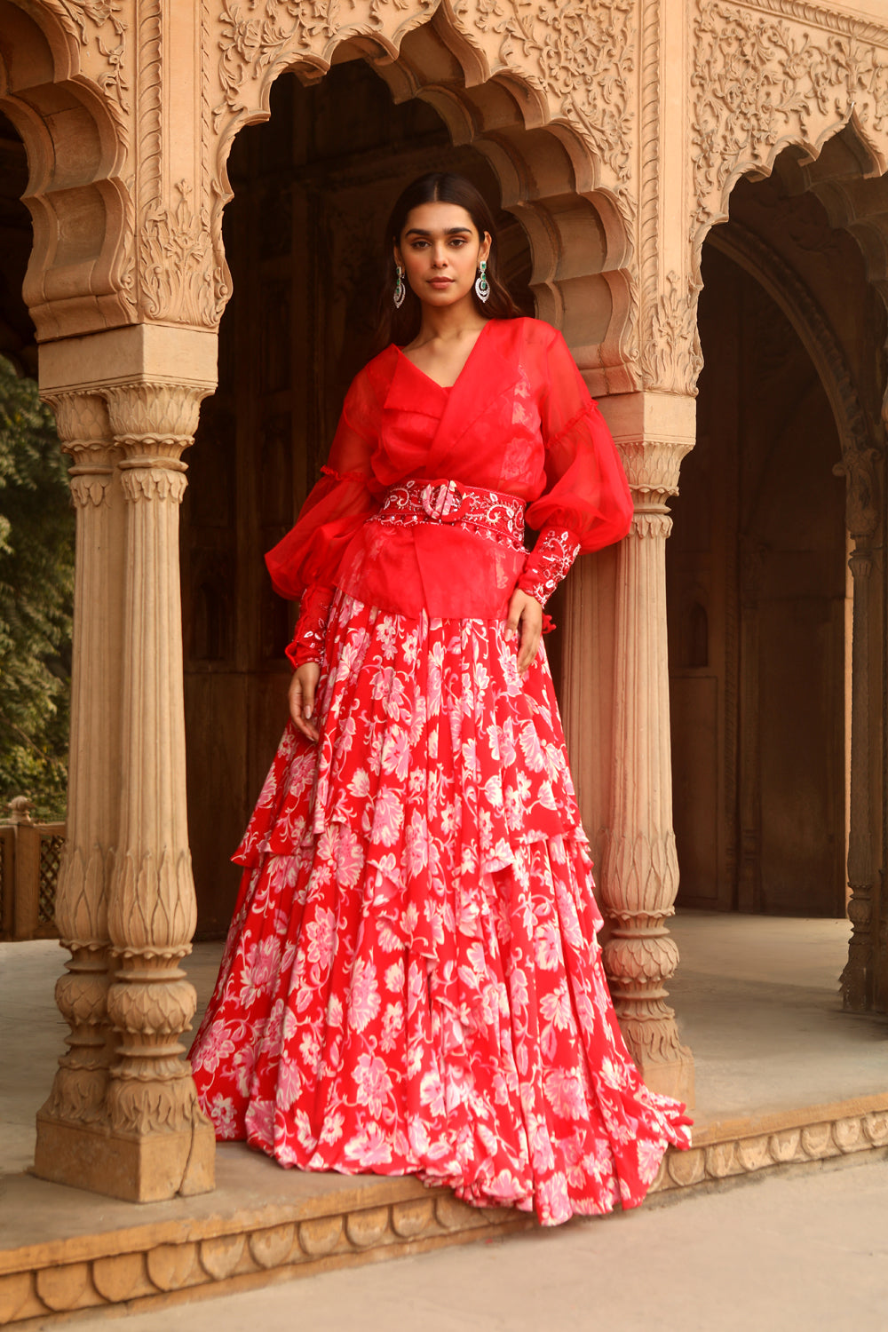 Embroidered beads and pearl work belt with organza jacket & printed lehenga set. the look of this ensemble is highlighted with multi layer printed skirt and scalop detalings on the jacket.