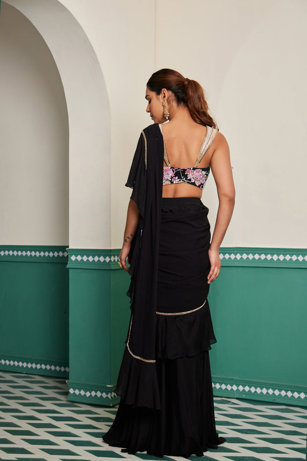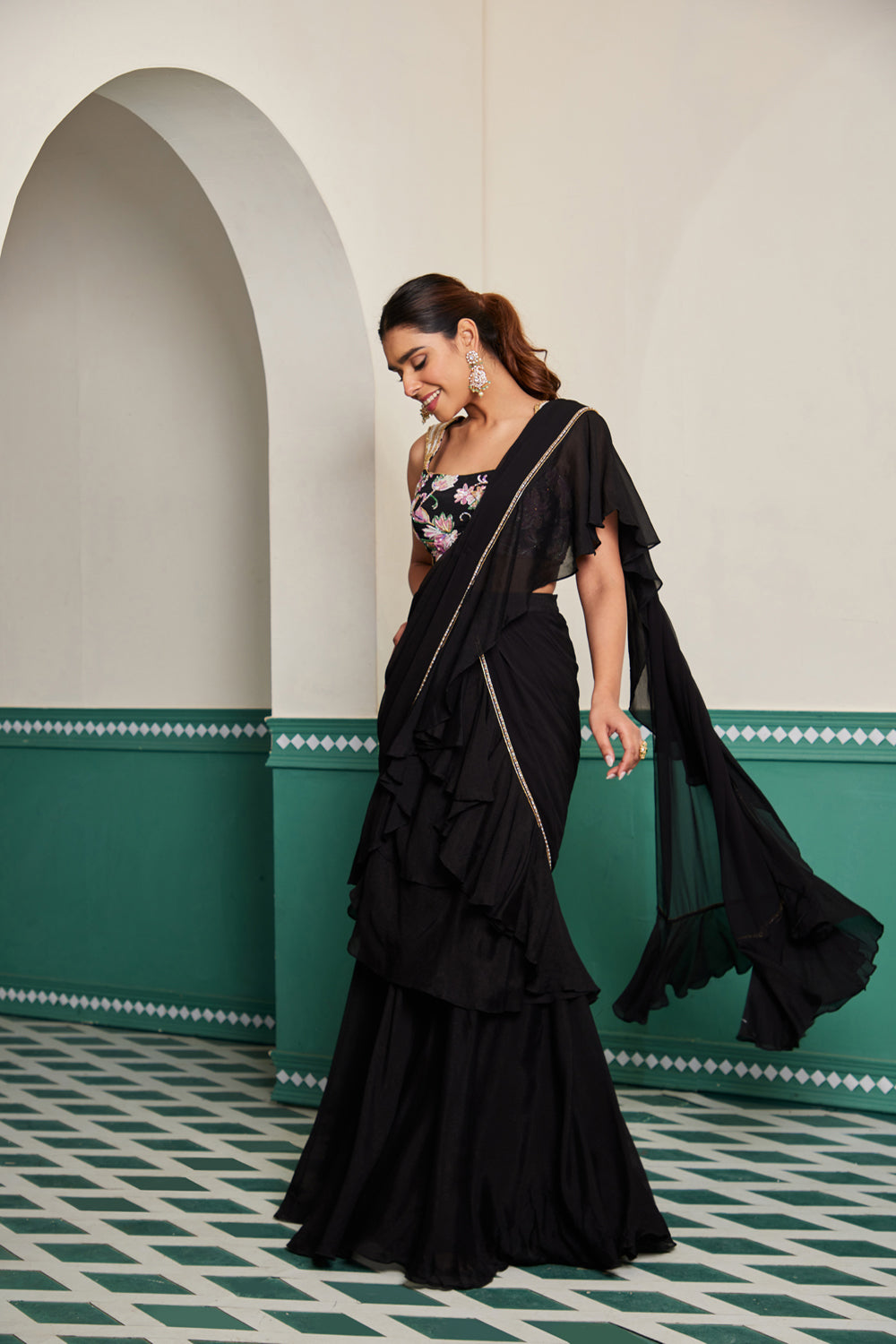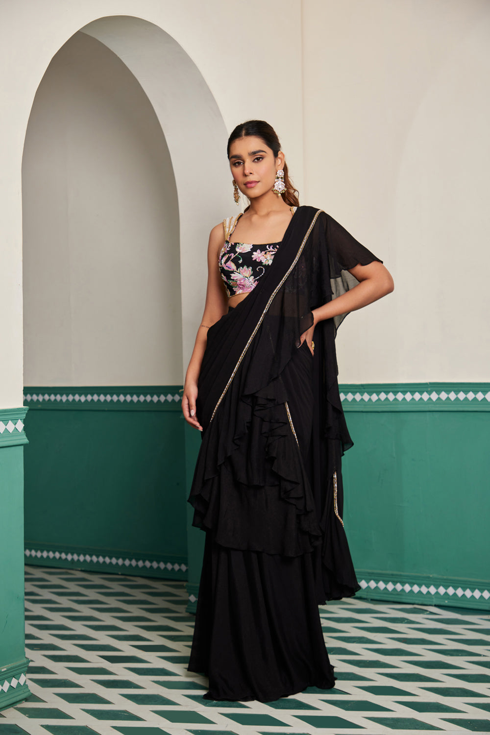Printed embroidered blouse with layer ruffle pre stitched saree set