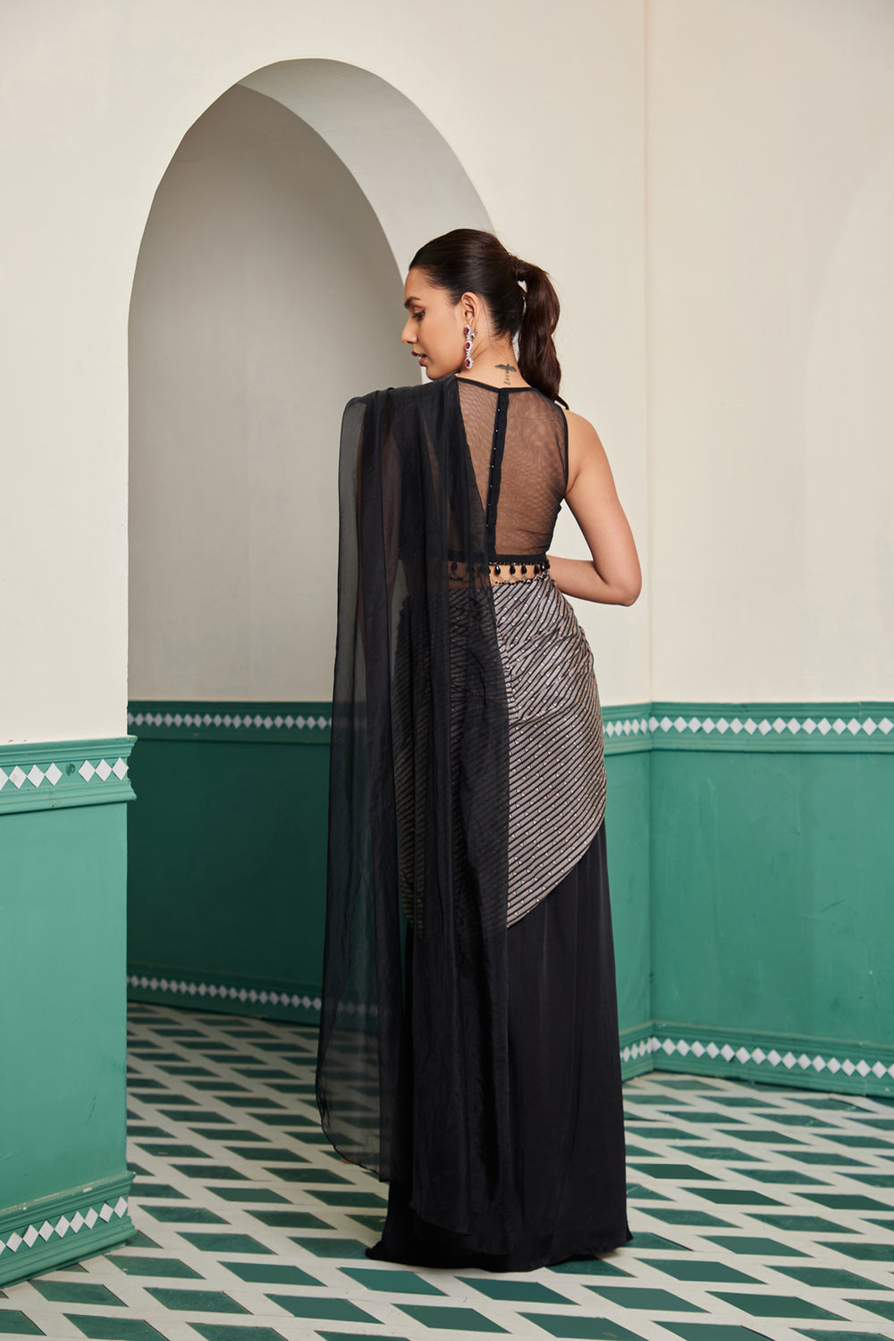 Embroidered tassle blouse with printed pre stitched drape saree set