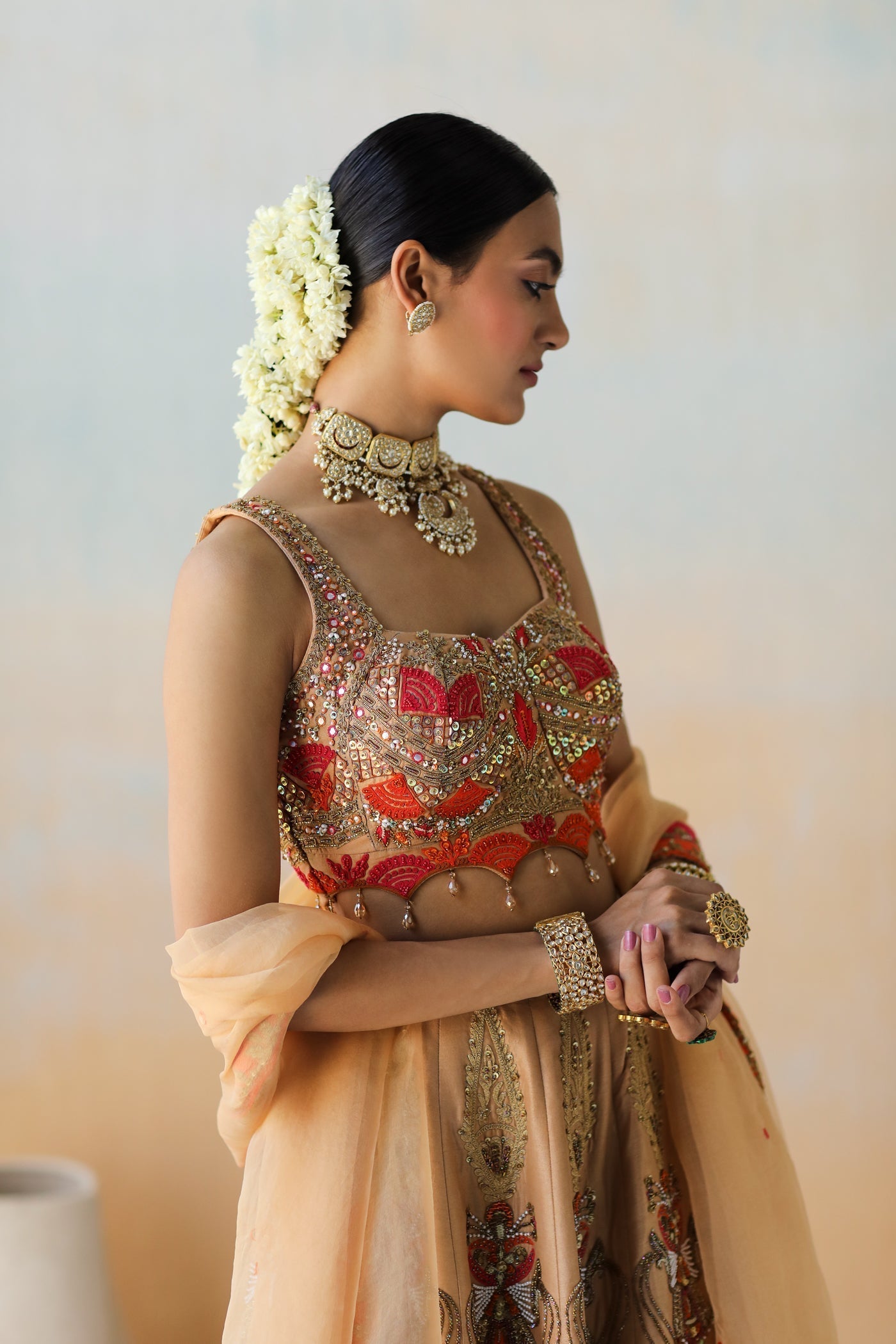 A dull gold lehenga set in dupion silk base featuring mutli-colored floral thread embroidery highlighted with sequins, cut dana and various other embellishments. it is paired up with an embroidered organza dupatta.