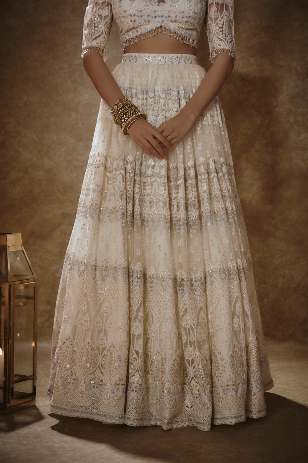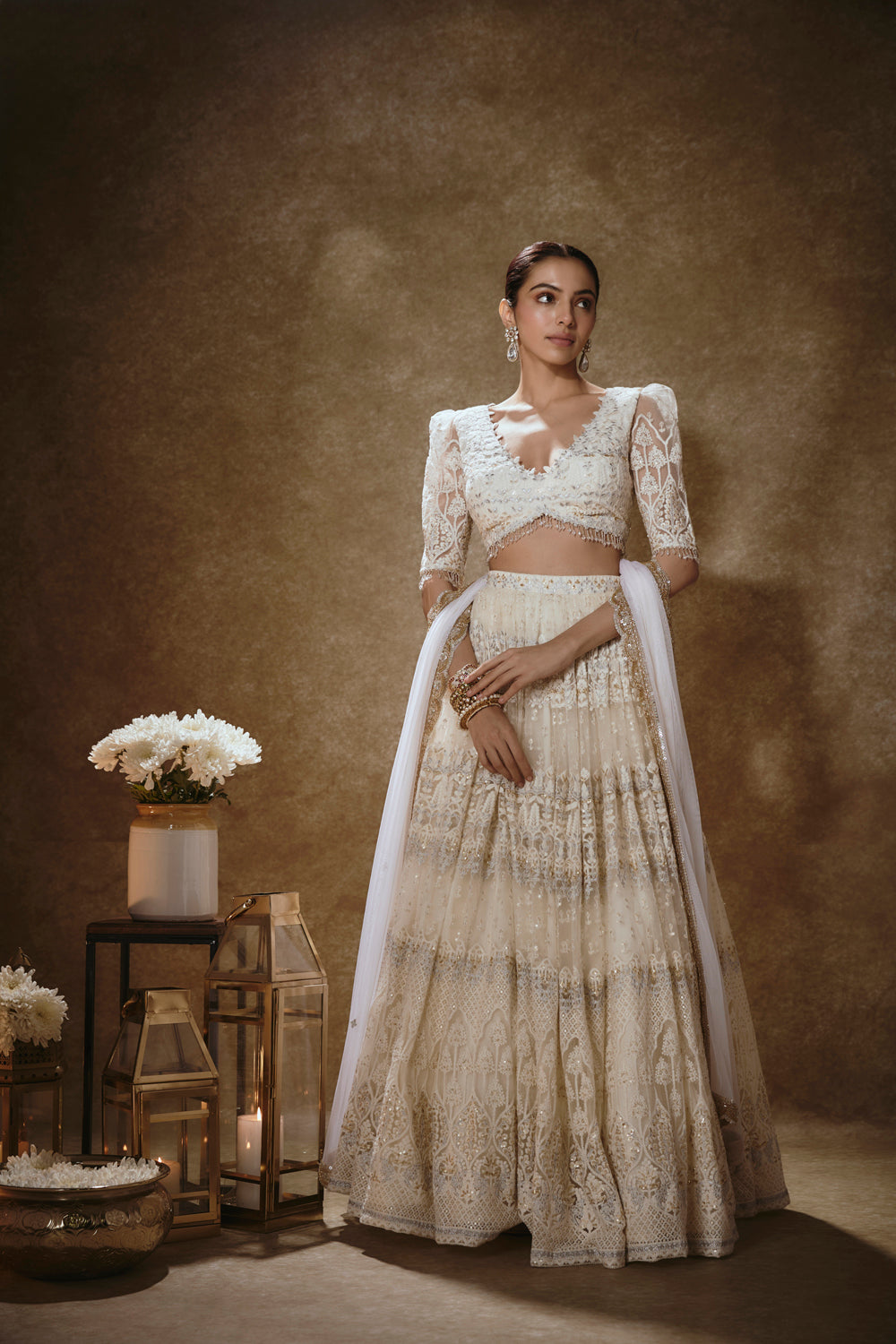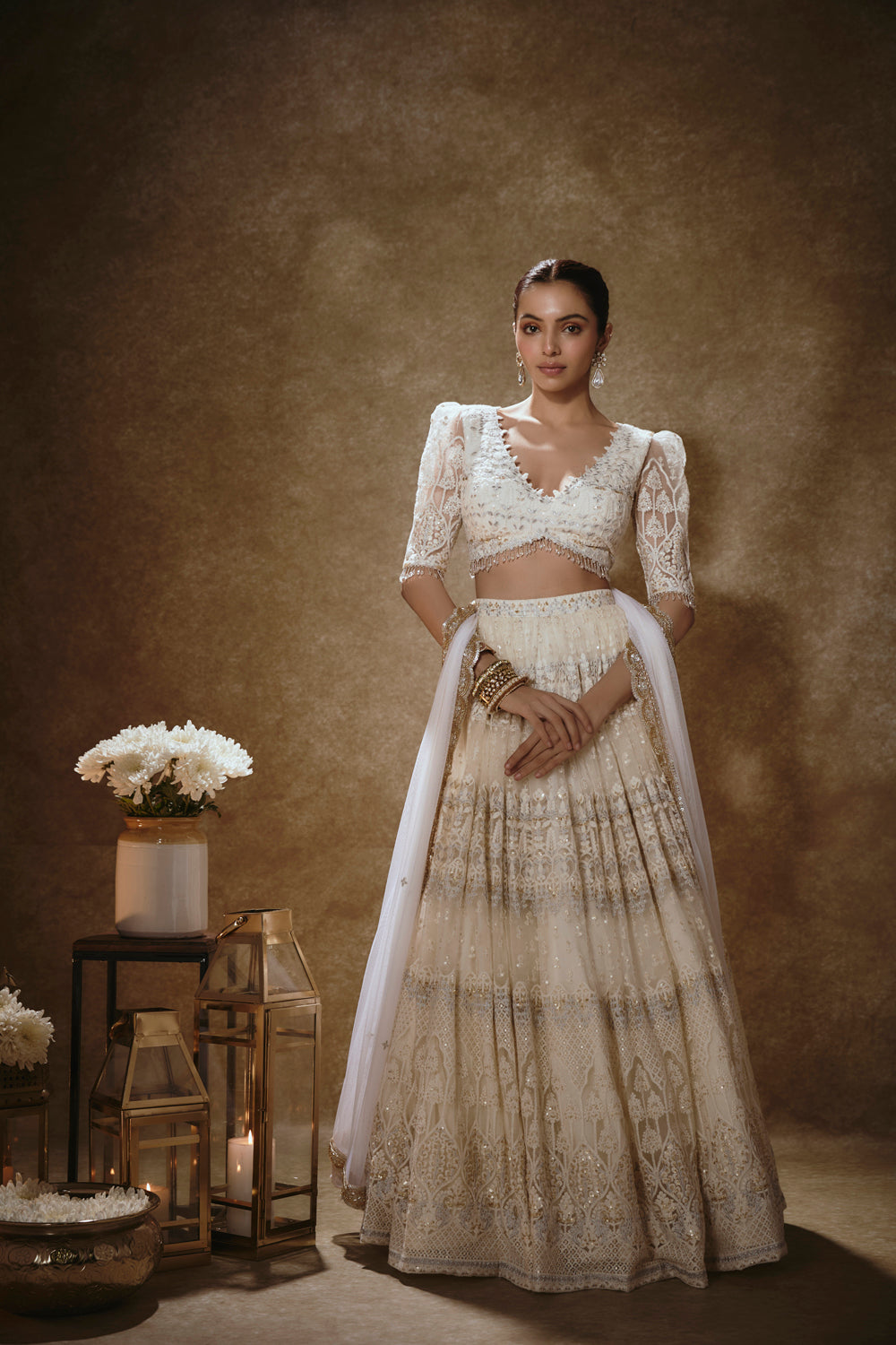 This look features a porcelain white & gold lehenga set, embroidered all over in thread, dori and sequins. it is teamed with a puff sleeved blouse with v neck & matching tassels at hem. a matching net dupatta with buttis and handcrafted cutdana & sequin border completes the look. cancan & pockets are included