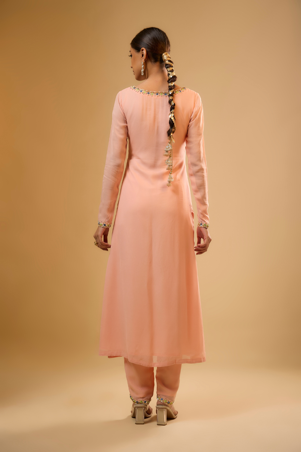 Peach sorbet georgette kurta pants set with mirrors and multicoloured embroidery