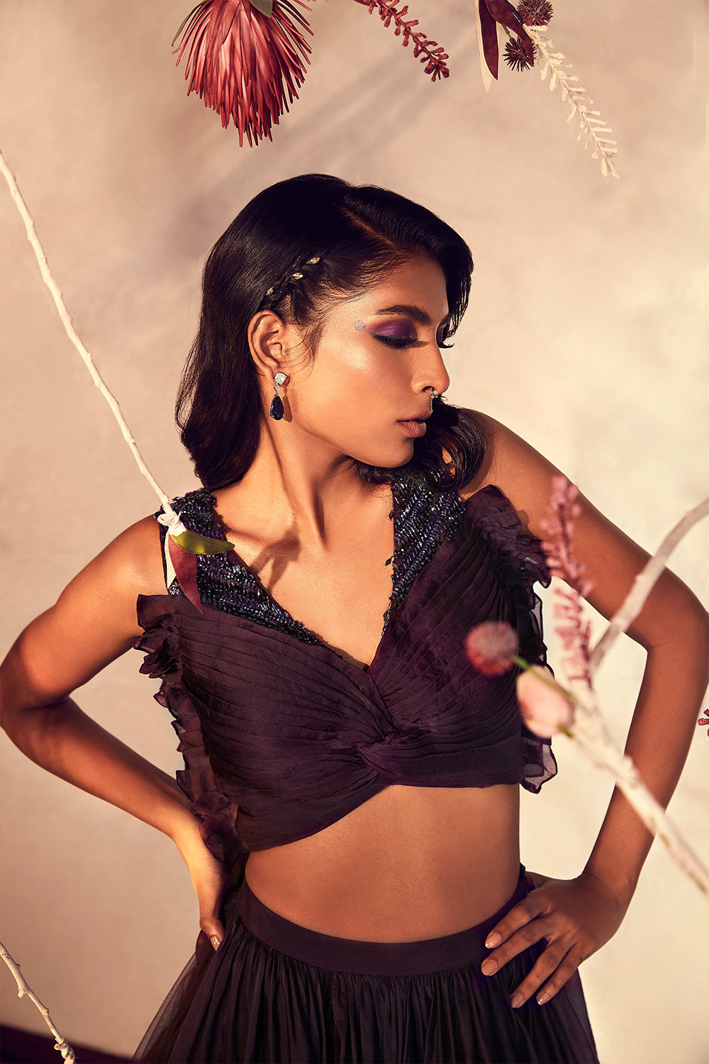 Blackberry wine bougie lehenga of tulle and organza panels lined with monochrome fringes teamed up with ruched butterfly bodice and dazzling crystal embroidery.