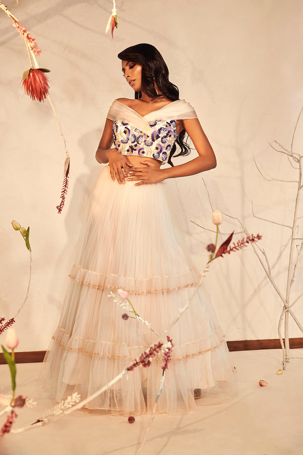 Rose ivory lehenga in tulle lined with crystal embroidery on the tiers, teamed up with contrasting 3D ombre flowers, thread work and crystals on the bodice.