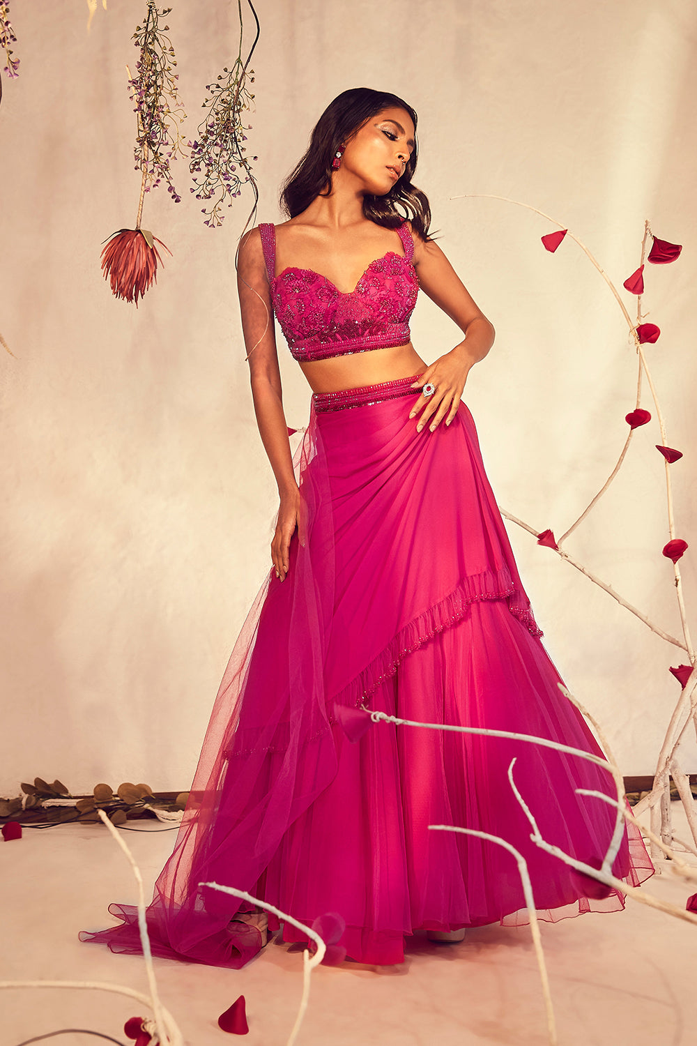 Hibiscus coloured jumpsuit and 3D embroidery with glimmering sequins, beads and cords adorning the surface.