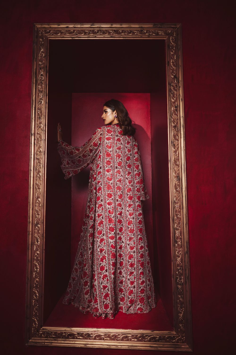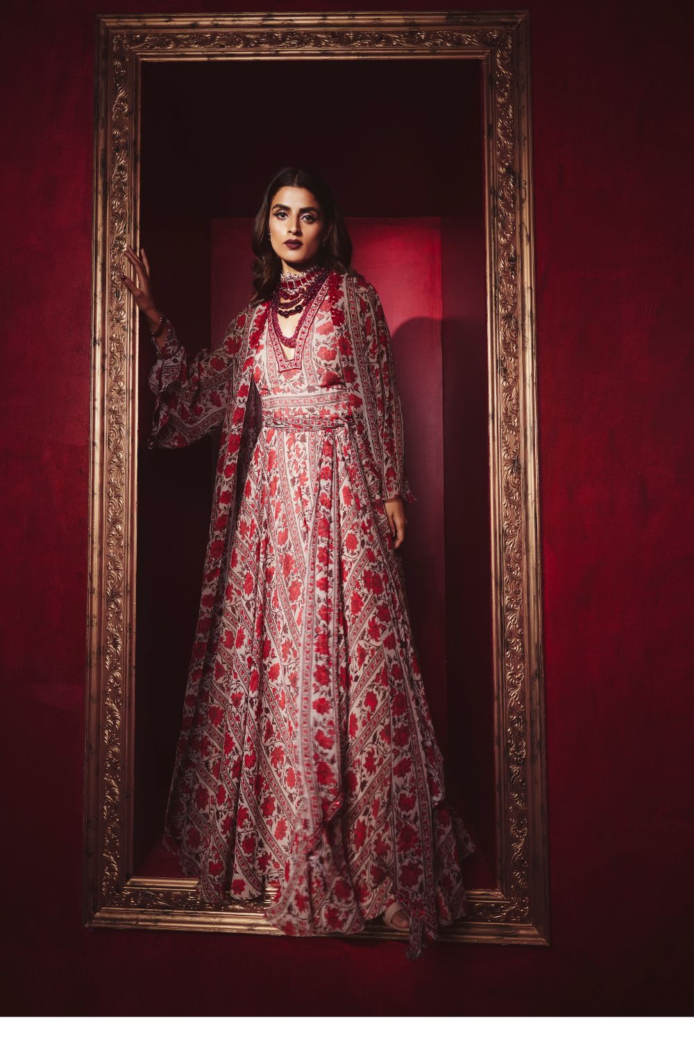 Red beige printed chiffon jumpsuit and printed chiffon jacket with printed chiffon tie up
