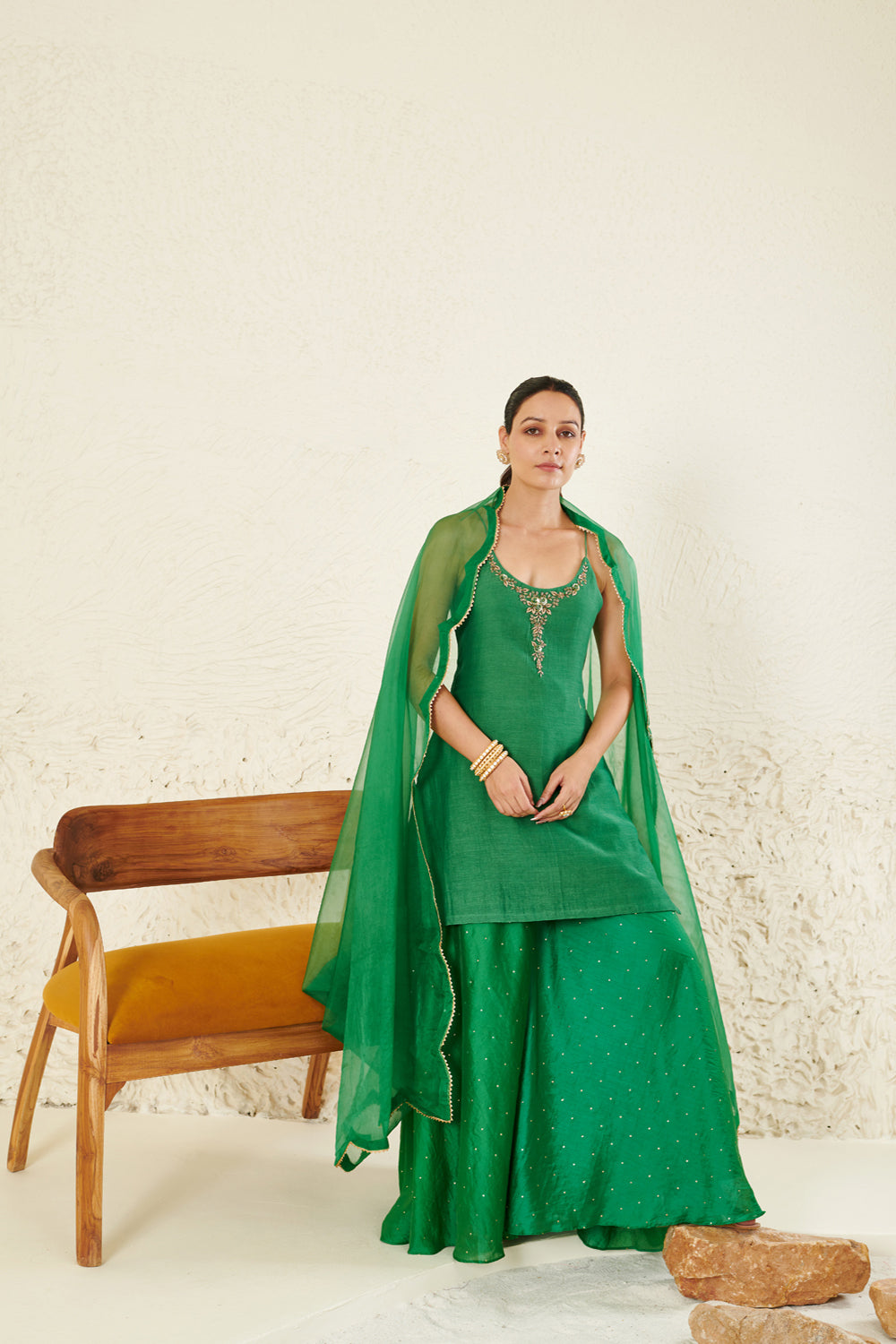 Plain chanderi spaghetti kurta with hand embroidered sequins pearl & thread work on neck, all over mukesh workgarara with elastic waist band , big scalloped organza dupatta with gota border.