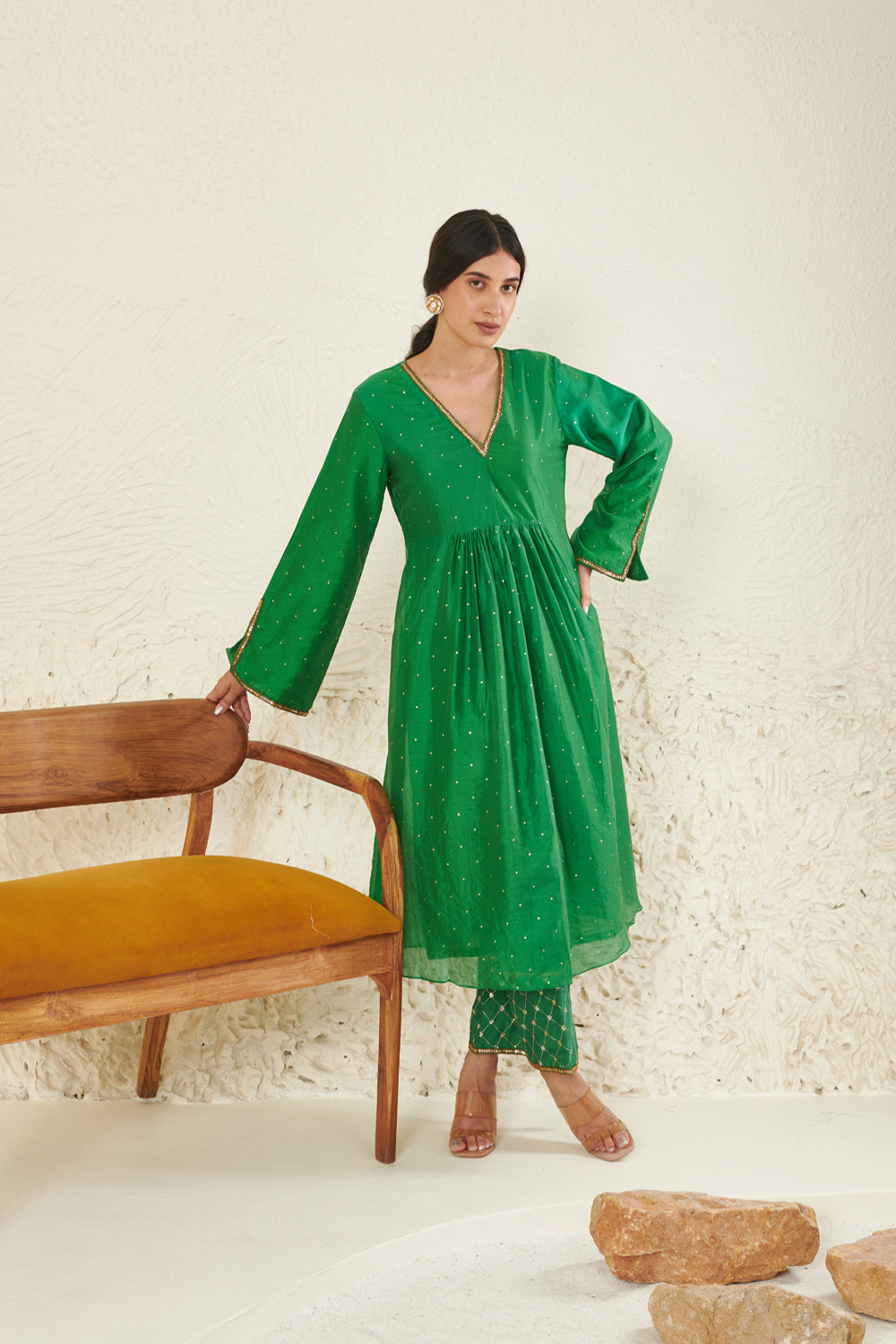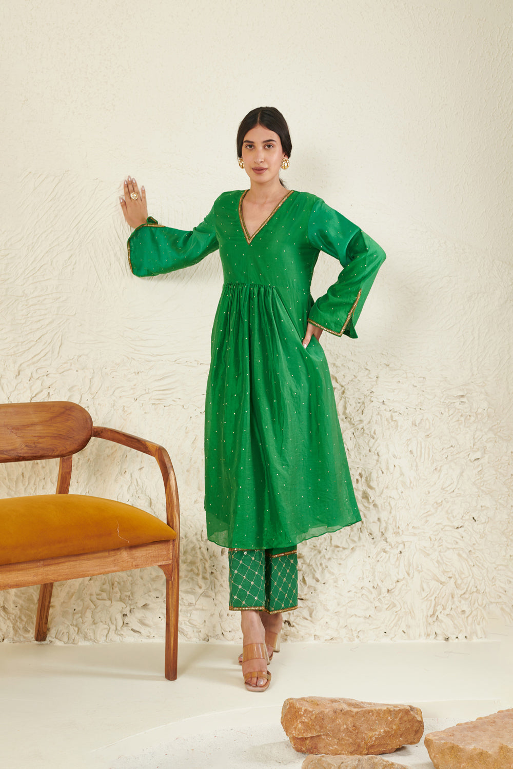All over mukesh work chanderi hand embroidered v neck front pleated kurta, bell sleeves with sequins work on the slit , plazo pants with thread & sequins embroidery & elastic waistband.