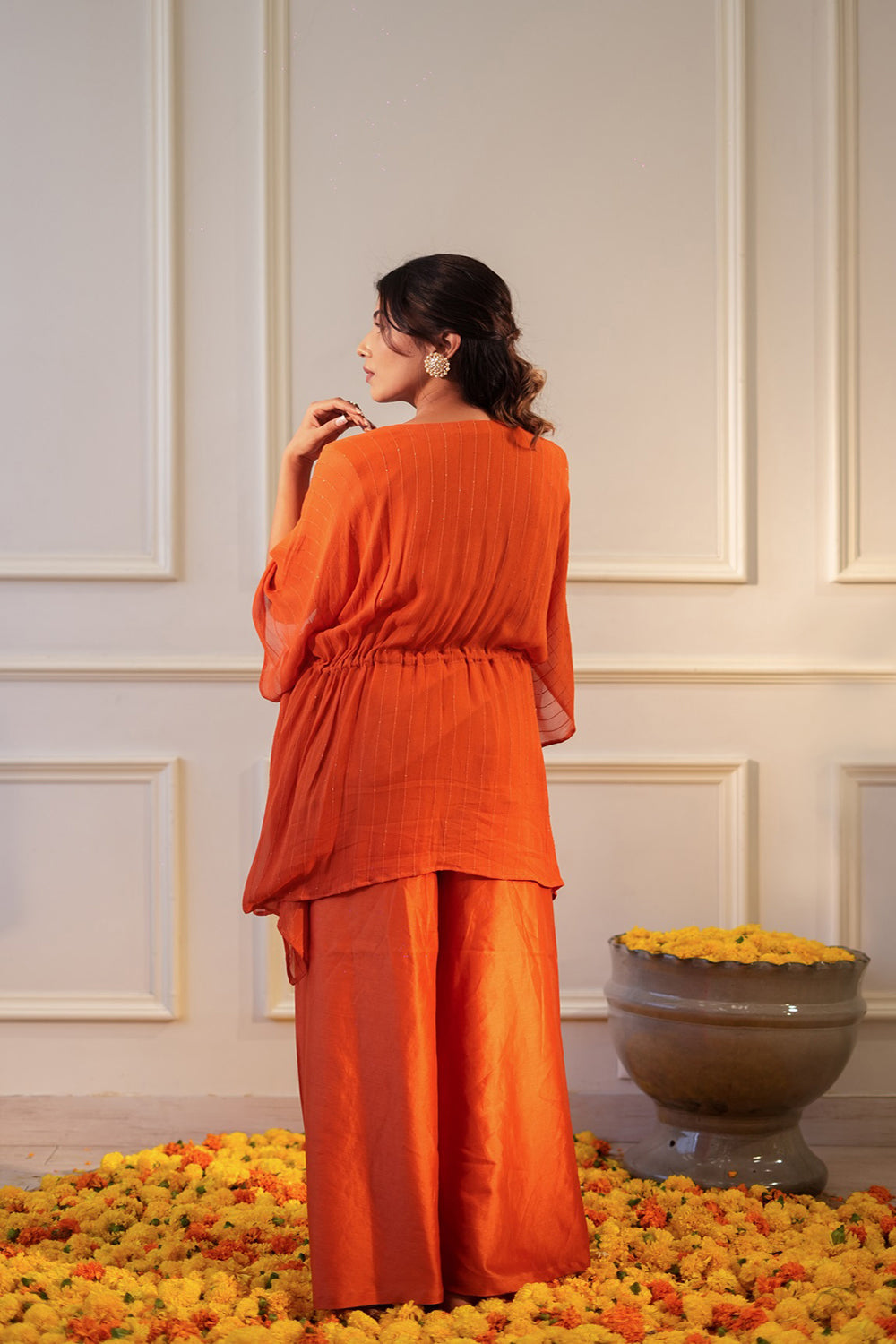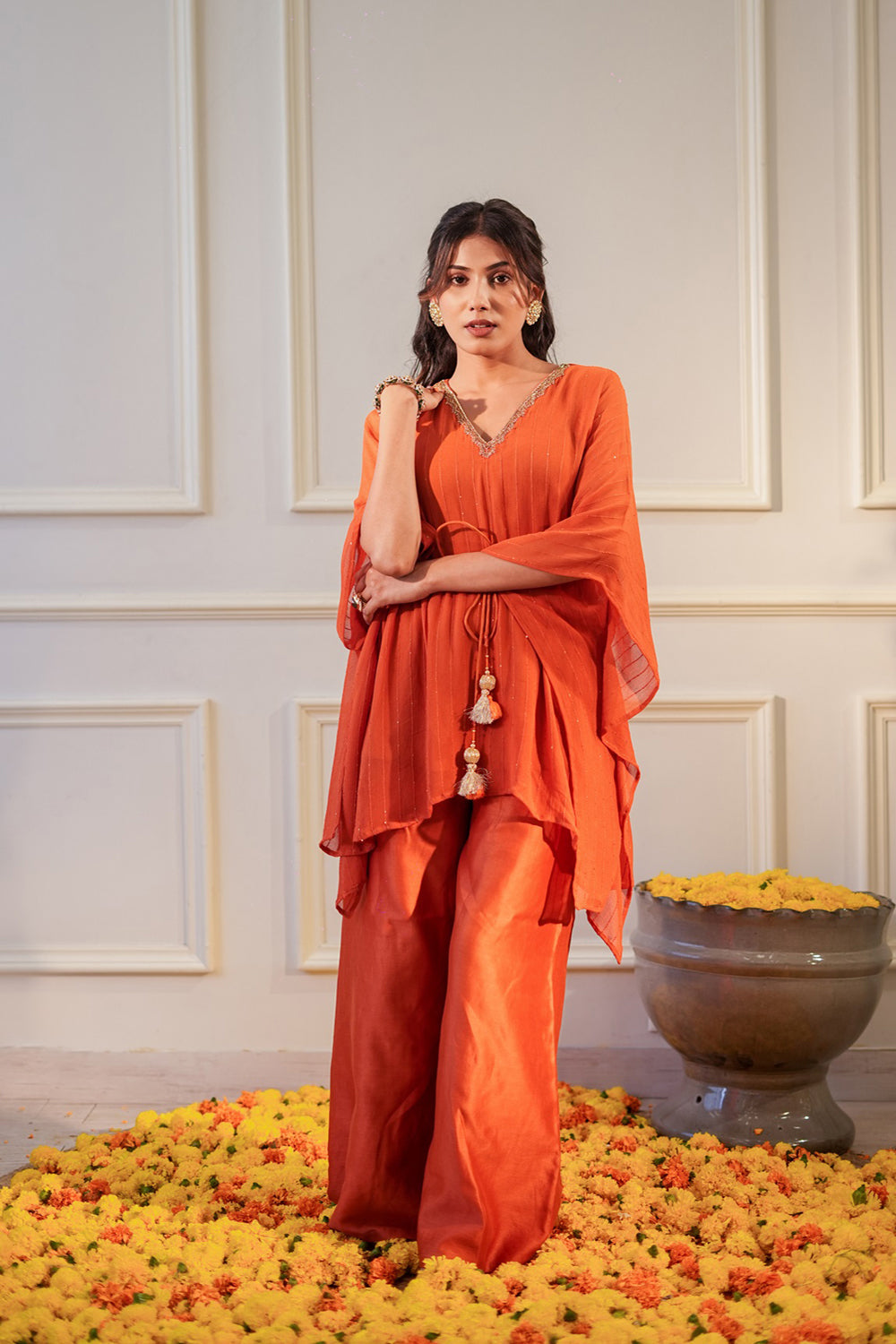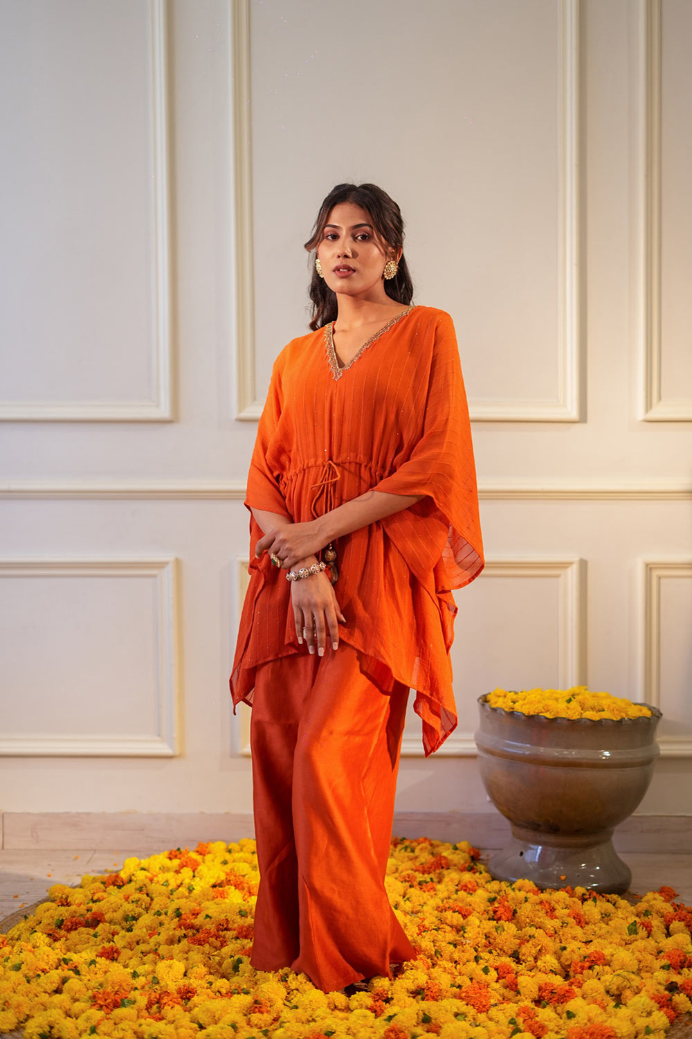 A sequin georgette kaftan with delicate hand embroidery at the neck, drawstring at the waist with tassle, chnaderi silk flared pants with elastic for a comfort fit