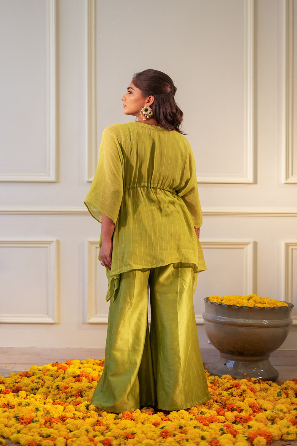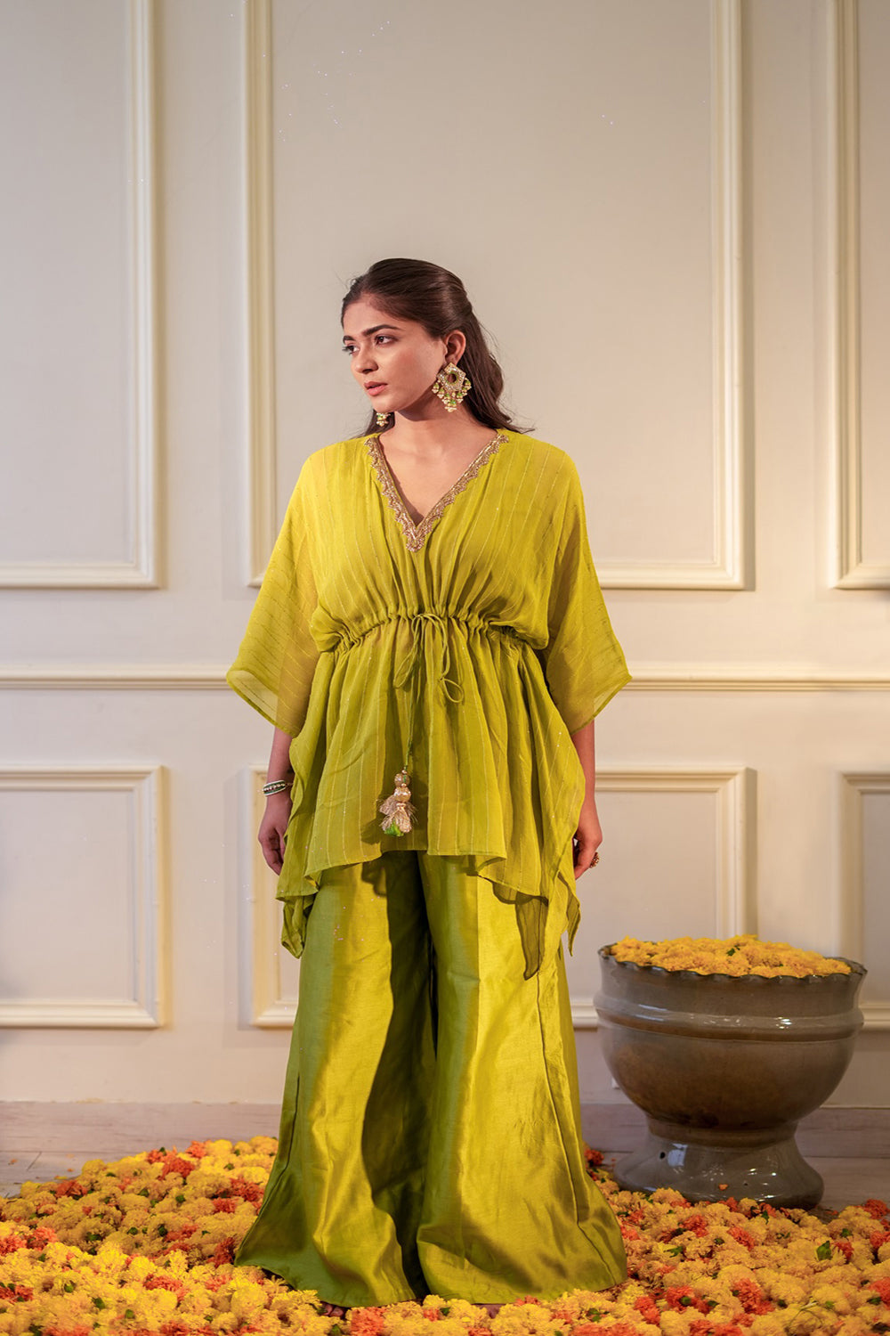 A sequin georgette kaftan with delicate hand embroidery at the neck, drawstring at the waist with tassle, chnaderi silk flared pants with elastic for a comfort fit