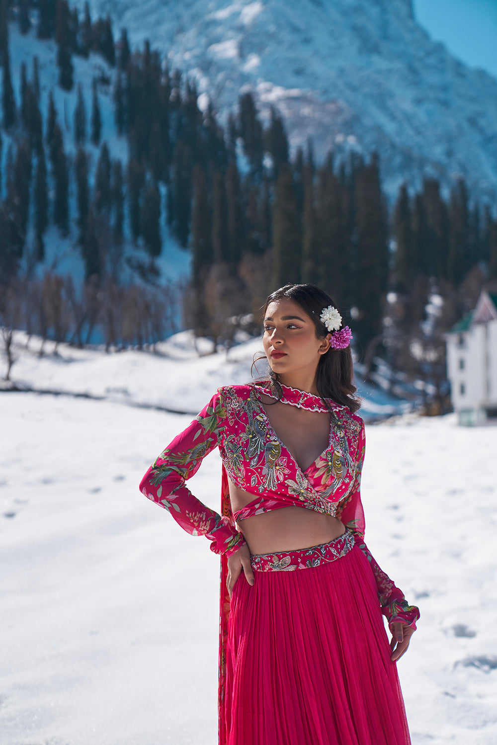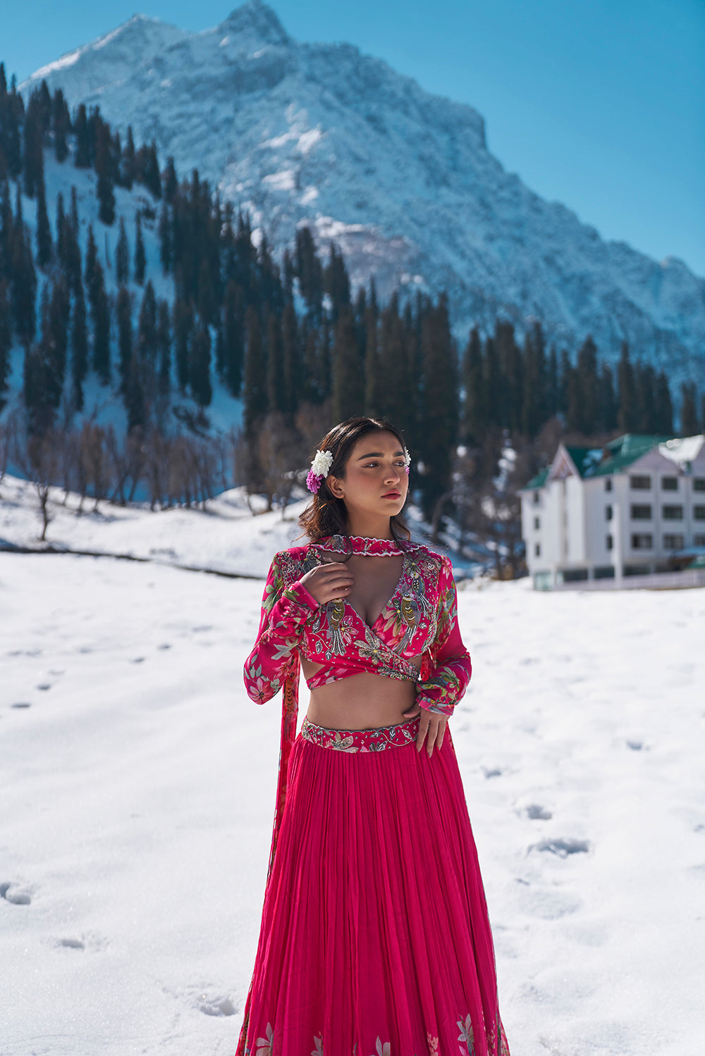 fuschia pink floral hand embroidered wrap blouse with pleated lehanga made in georgette fabric
