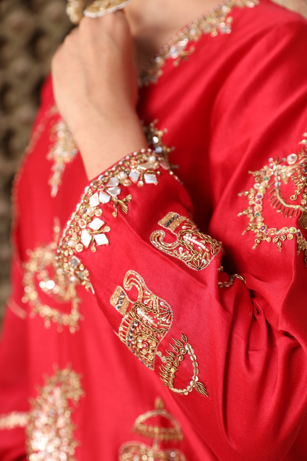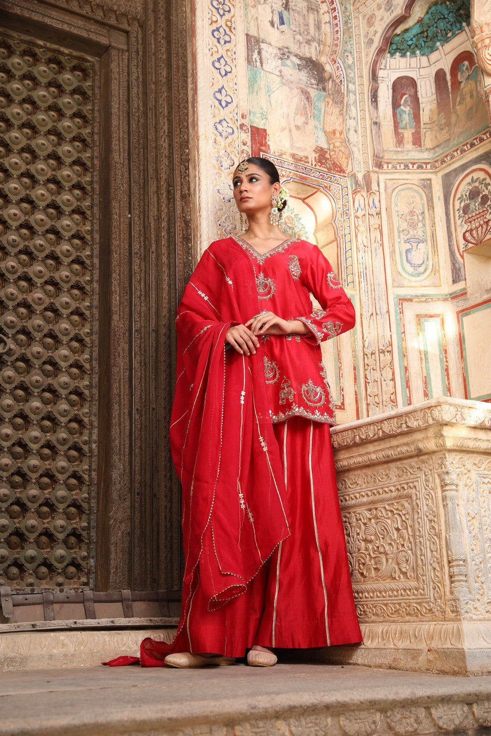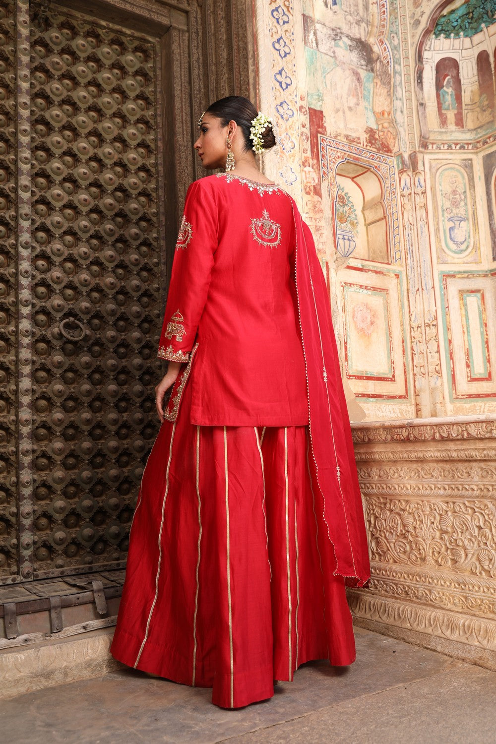 Make a grand statement with our Gaj Sharara Set, crafted in rich silk and lined with soft cotton for comfort. The elegant red kurti features intricate gota patti and zardosi hand embroidery, paired with a flowing sharara and a complementing dupatta. Perfect for festive occasions and weddings, this ensemble radiates timeless charm.