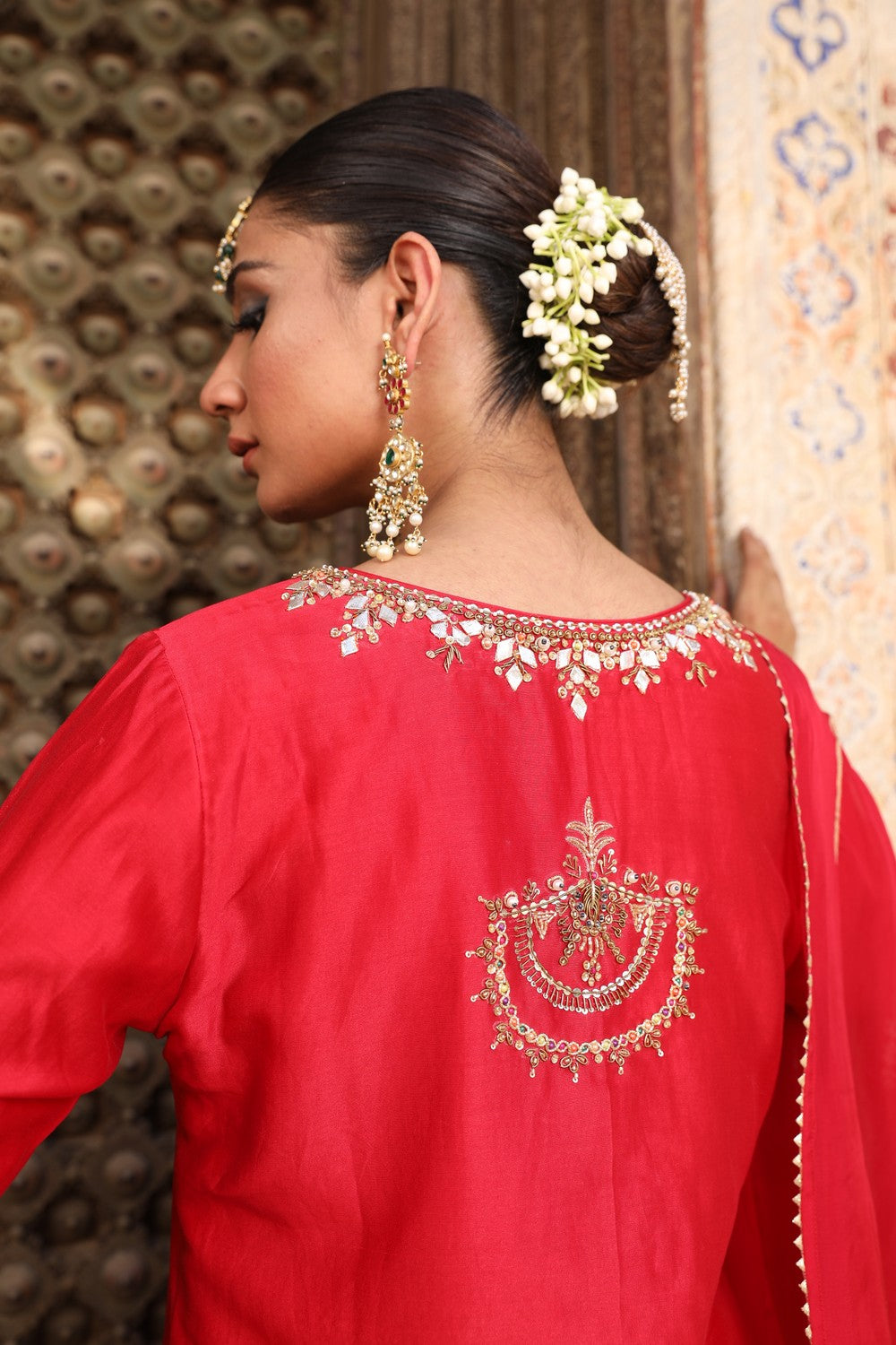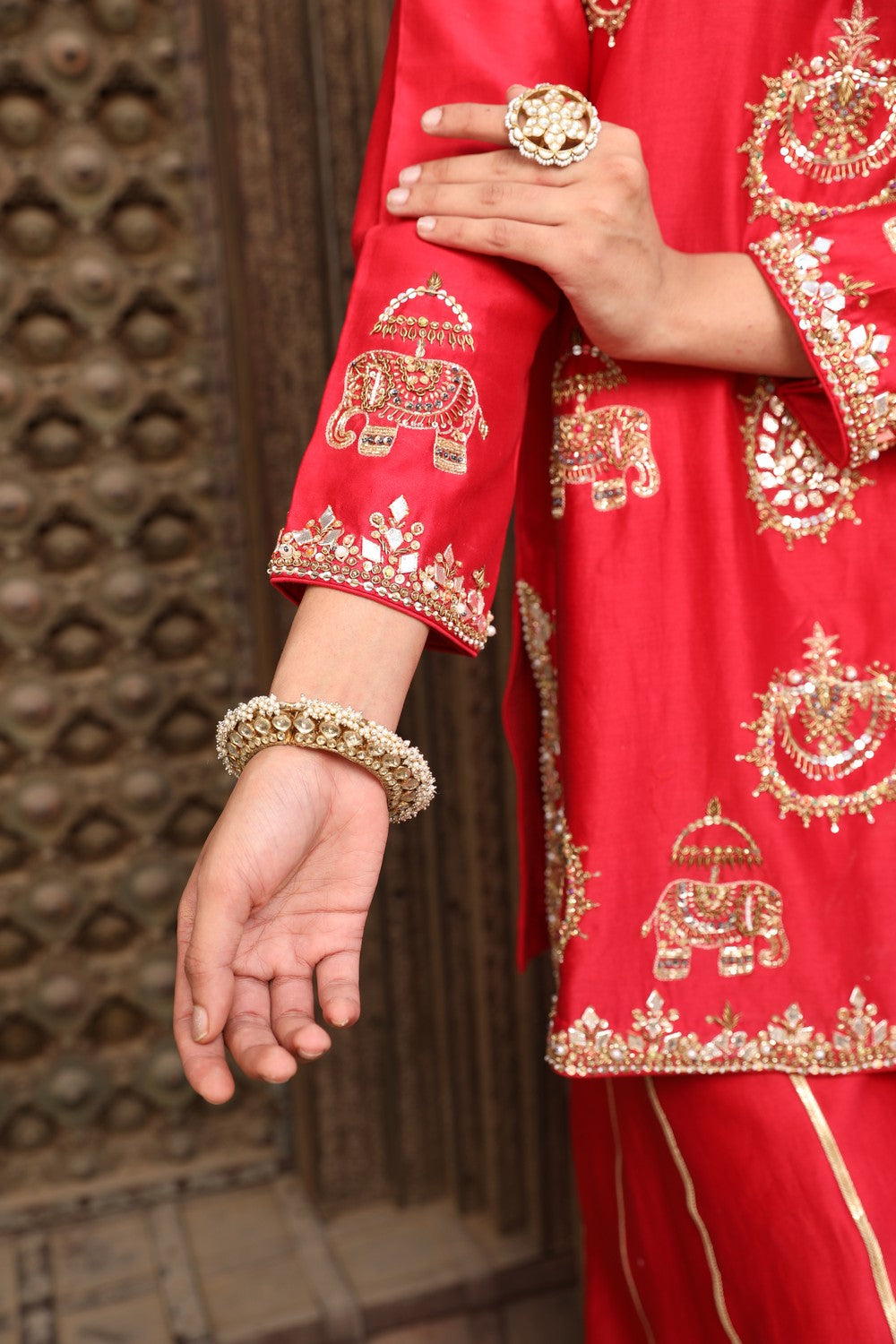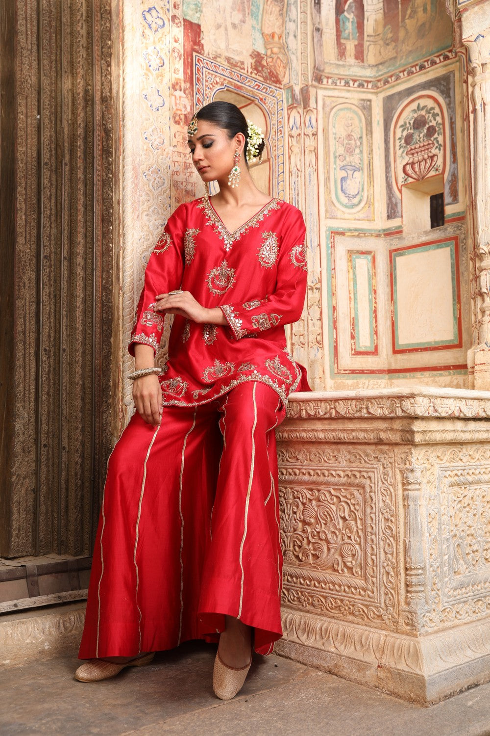 Make a grand statement with our Gaj Sharara Set, crafted in rich silk and lined with soft cotton for comfort. The elegant red kurti features intricate gota patti and zardosi hand embroidery, paired with a flowing sharara and a complementing dupatta. Perfect for festive occasions and weddings, this ensemble radiates timeless charm.