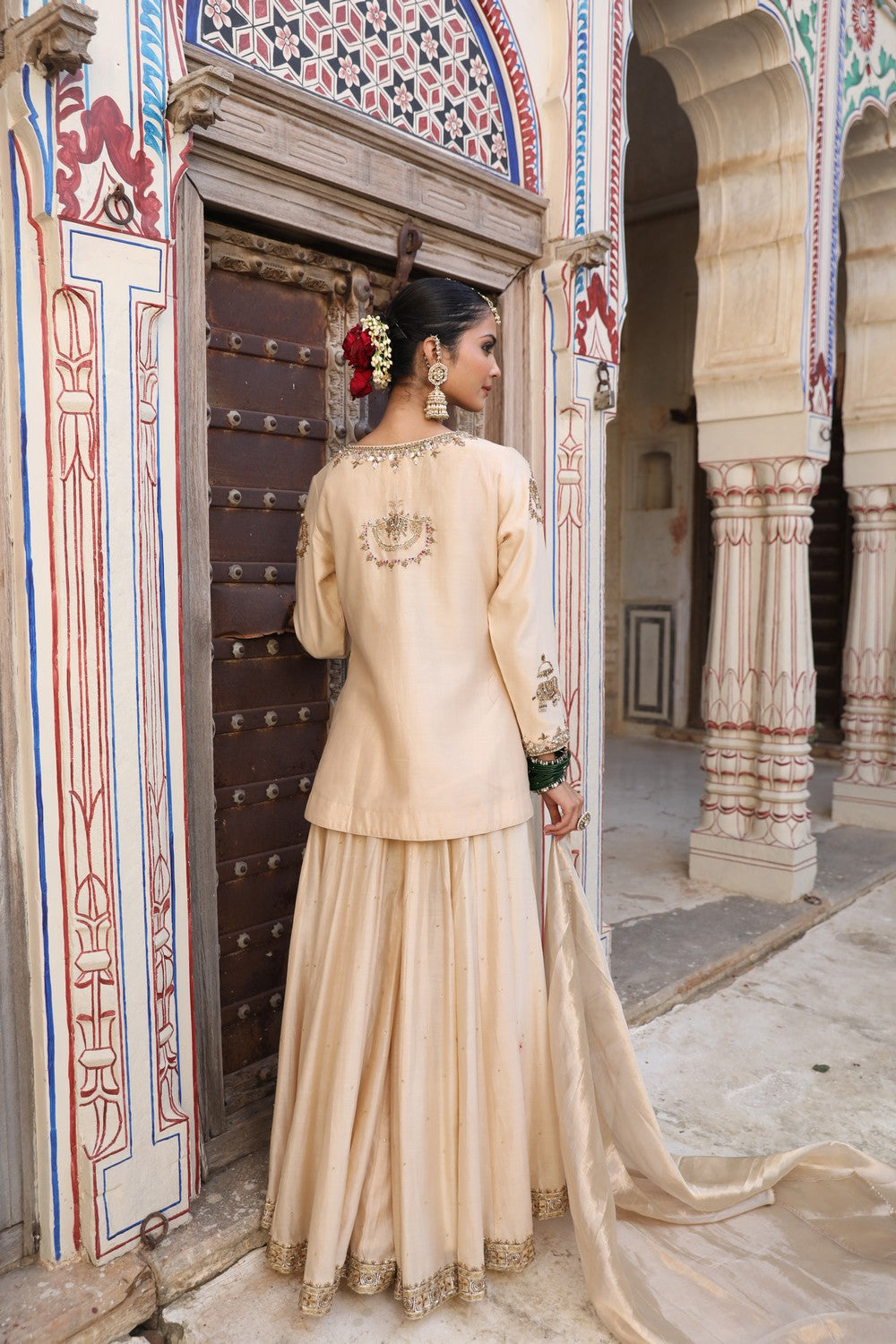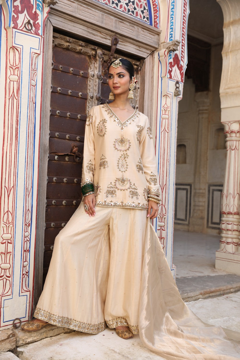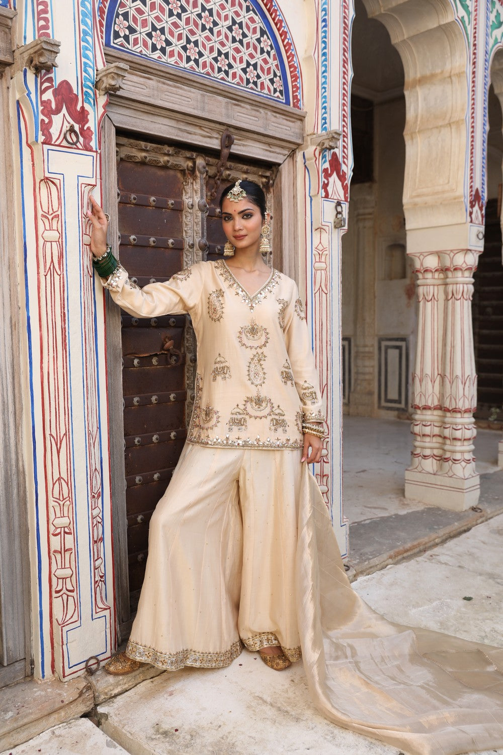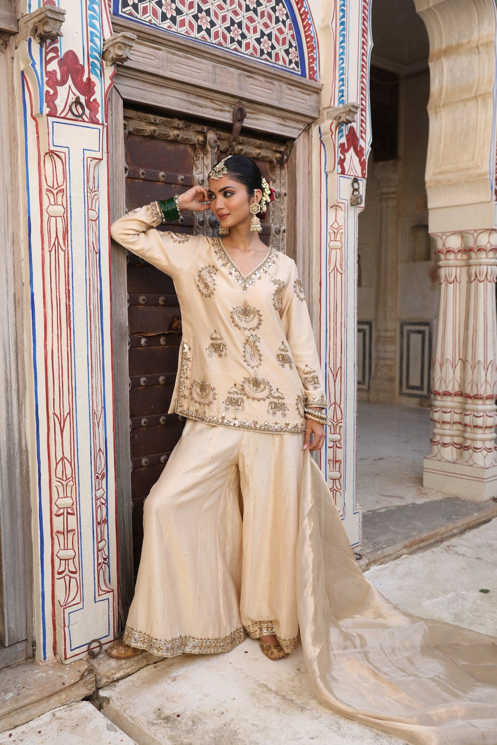 Elevate your festive look with the Gaj Sharara Set, crafted in luxurious silk and lined with soft 100% cotton for maximum comfort. The elegant beige kurti features intricate gota and zardosi hand embroidery, paired with a flowing 40-inch sharara and a 2.5-meter pure tissue dupatta. This 3-piece stitched set is a perfect choice for weddings and special celebrations, exuding traditional charm and sophistication.