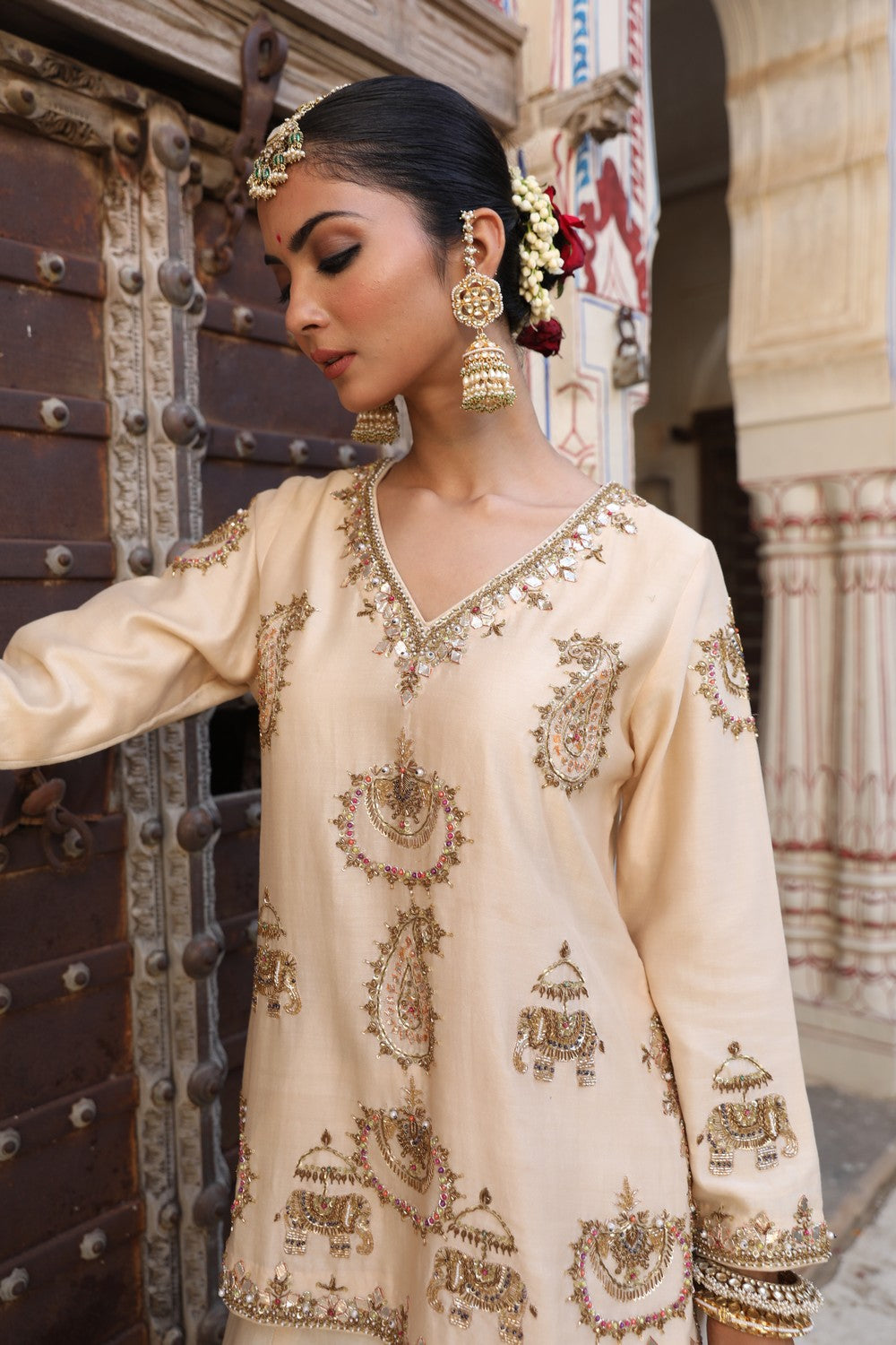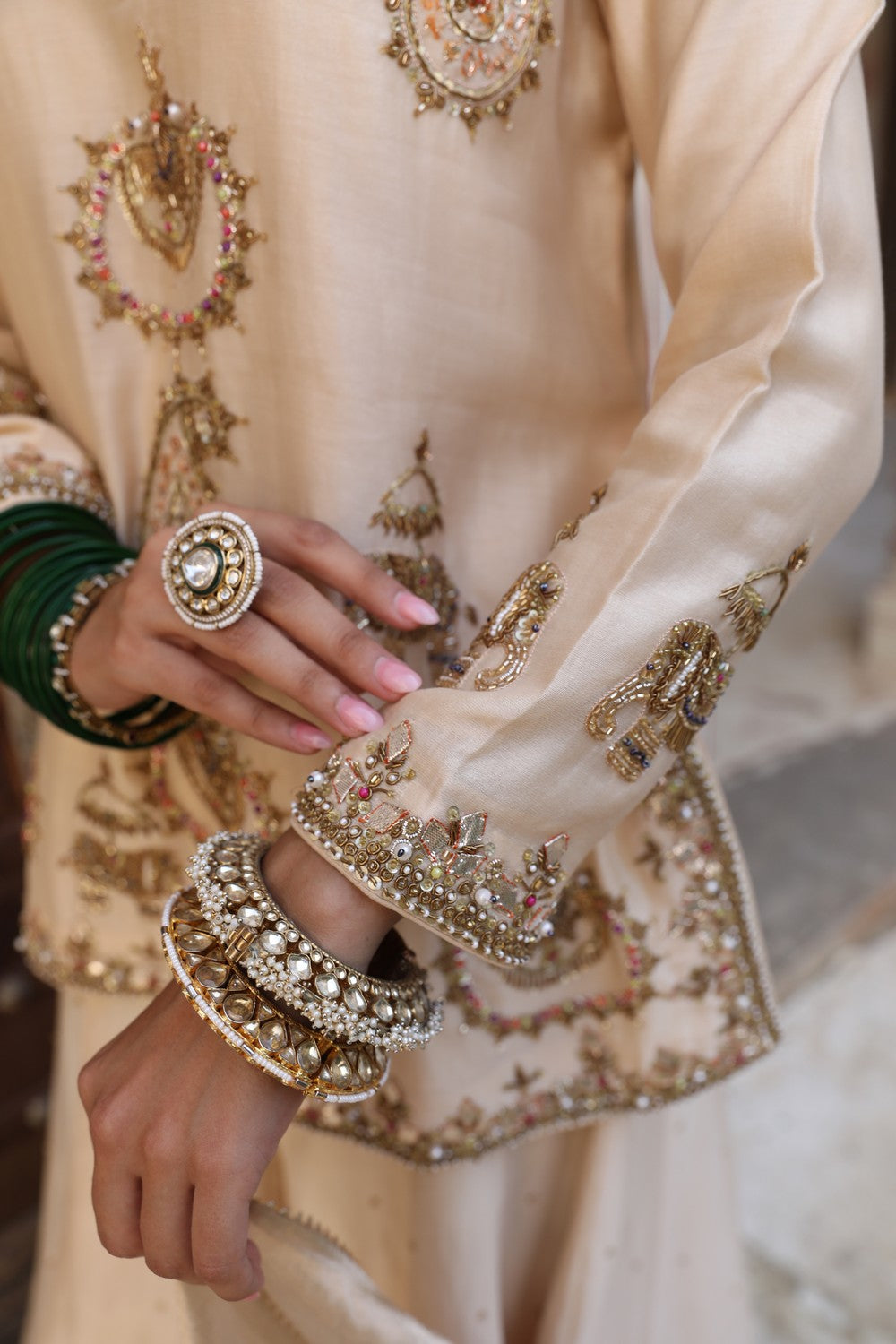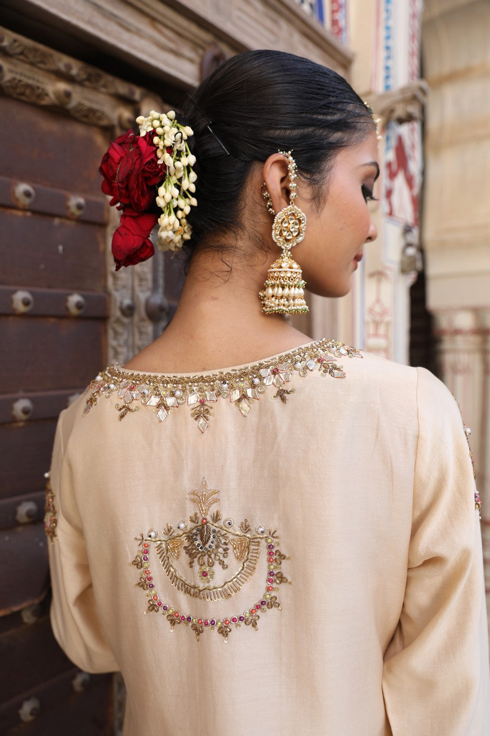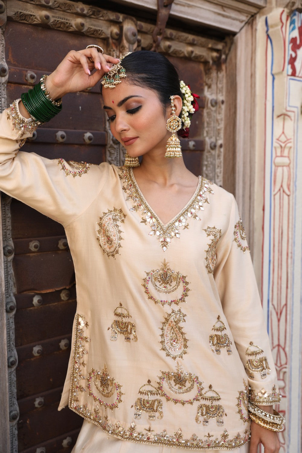 Elevate your festive look with the Gaj Sharara Set, crafted in luxurious silk and lined with soft 100% cotton for maximum comfort. The elegant beige kurti features intricate gota and zardosi hand embroidery, paired with a flowing 40-inch sharara and a 2.5-meter pure tissue dupatta. This 3-piece stitched set is a perfect choice for weddings and special celebrations, exuding traditional charm and sophistication.