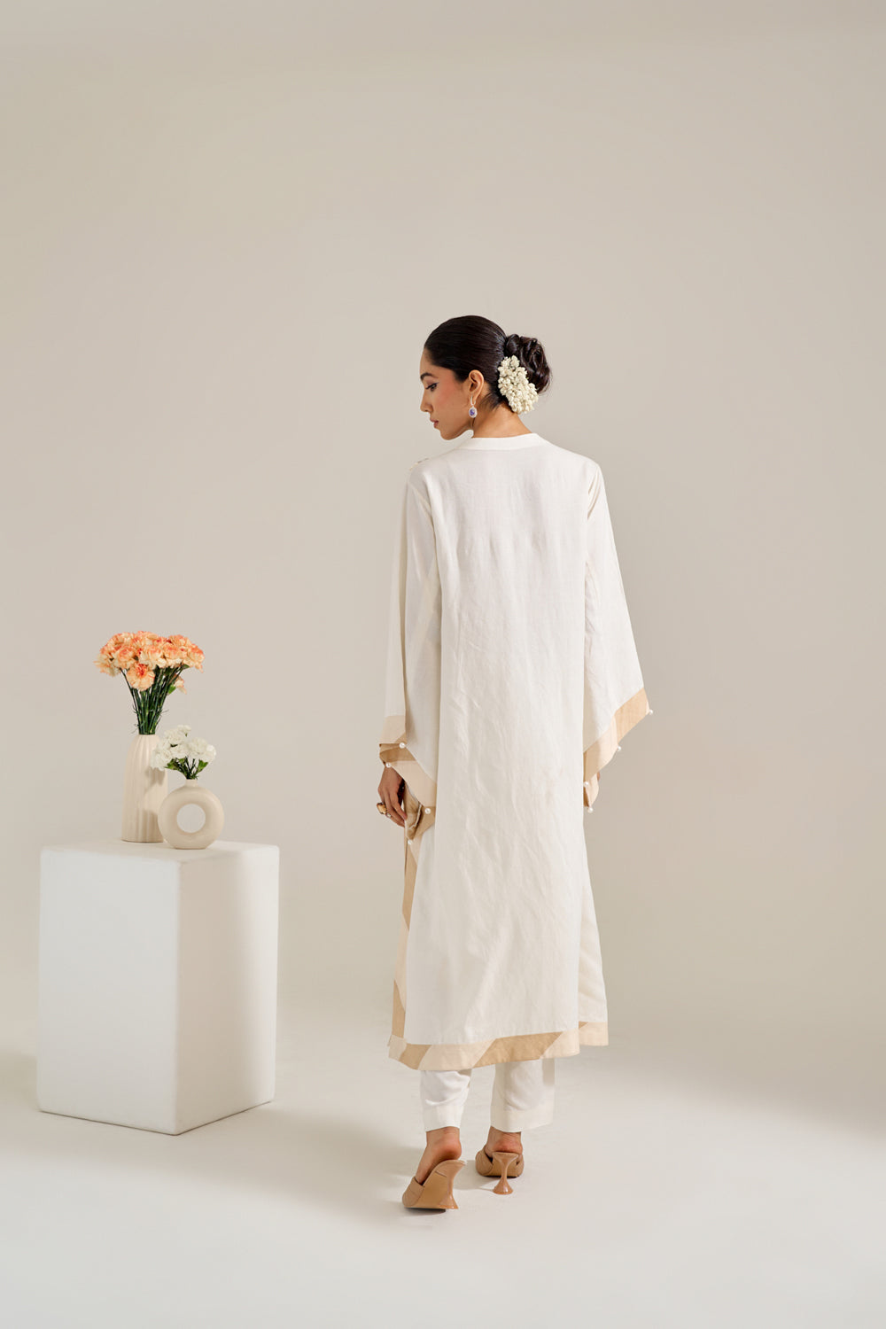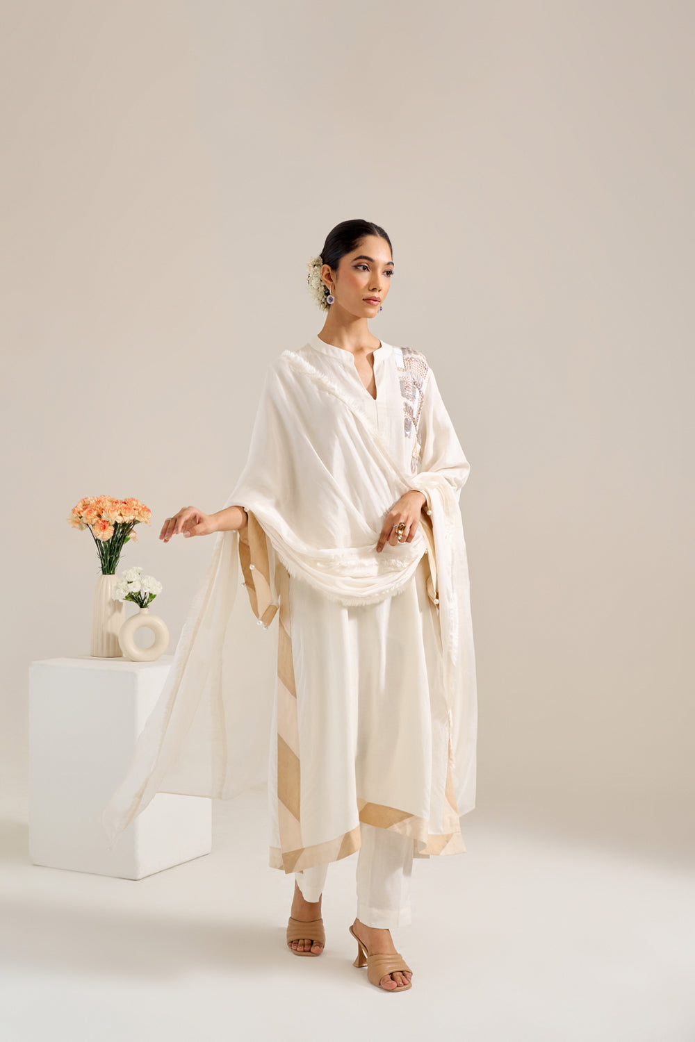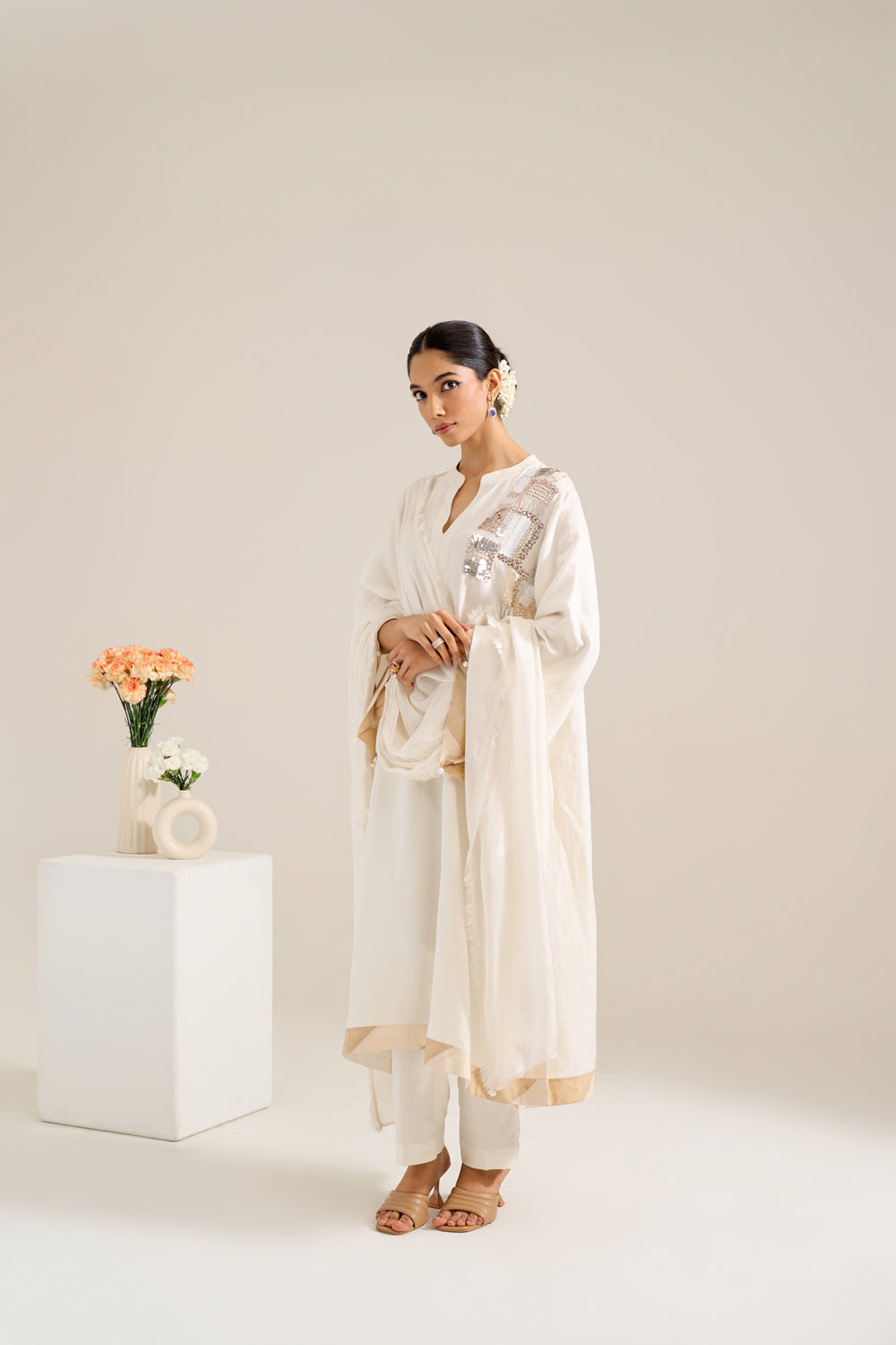 Long kurta with hand embellished shoulder paired with matching pants and dupatta