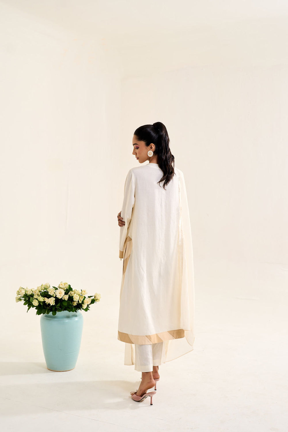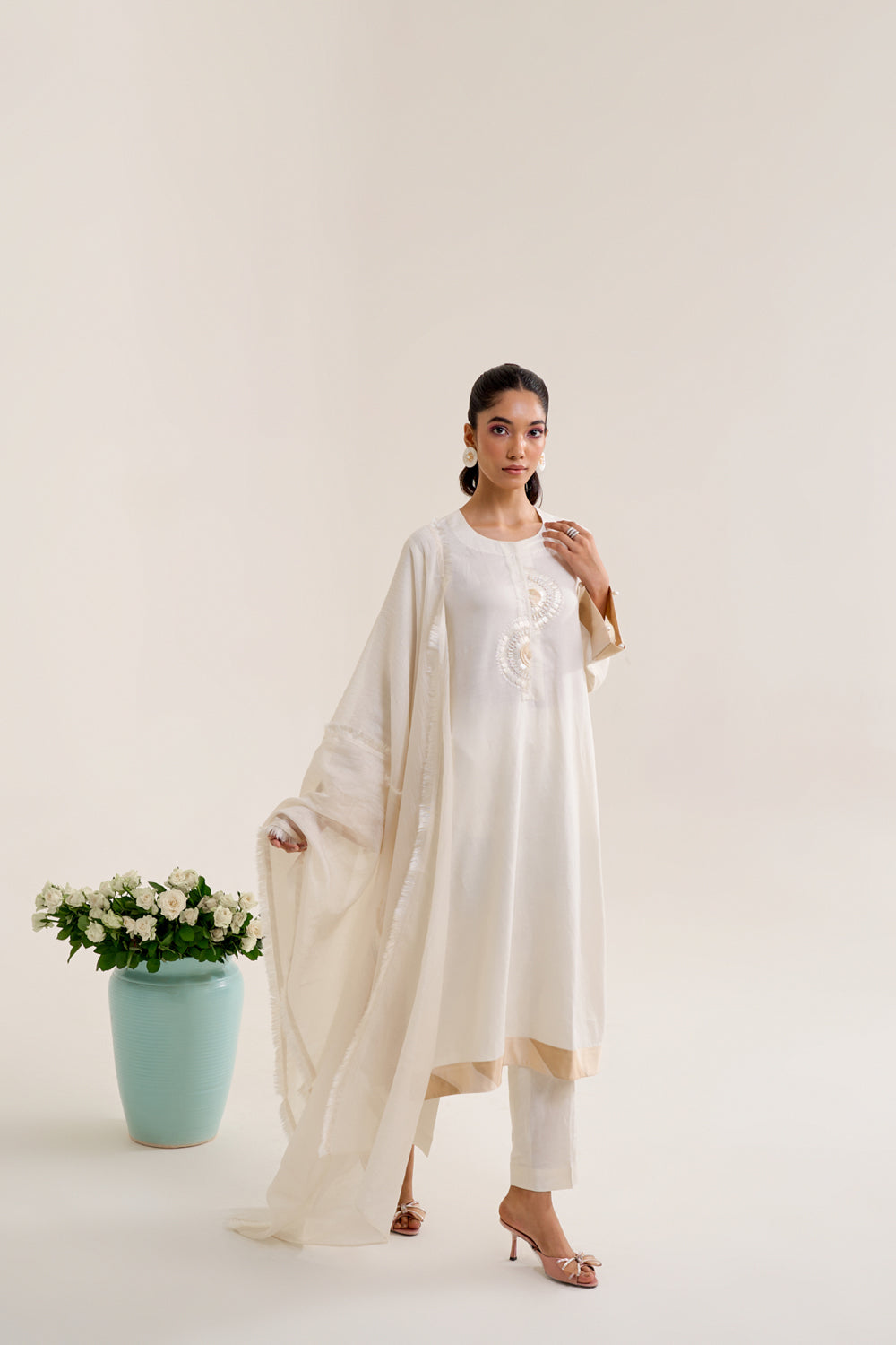 Long kurta with hand embellished neckline paired with matching pants and dupatta