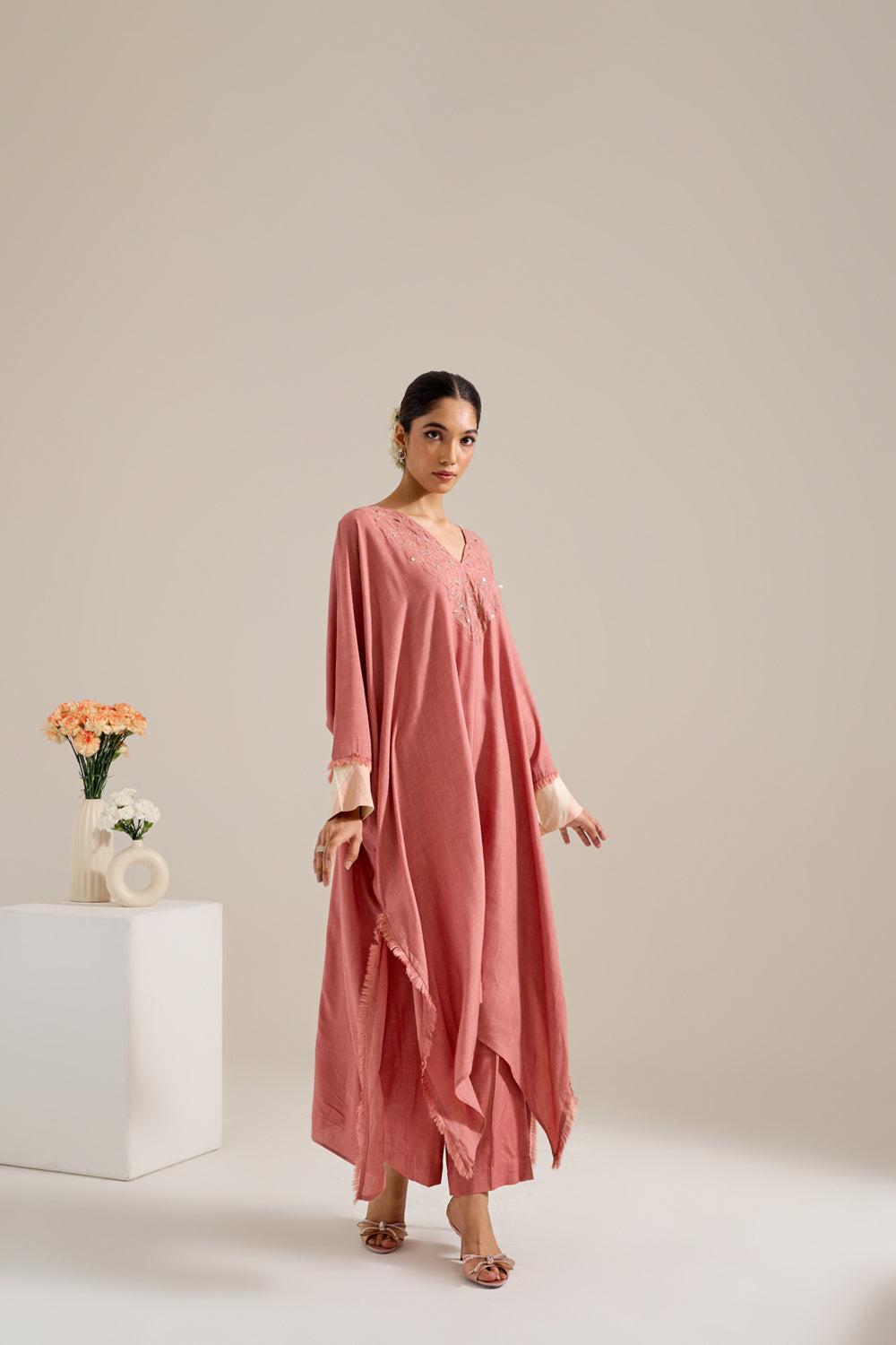 Kaftan style kurta with hand and machine embroidered neck and matching pants