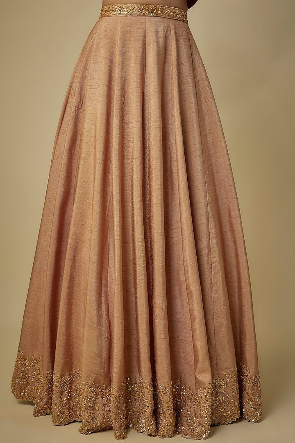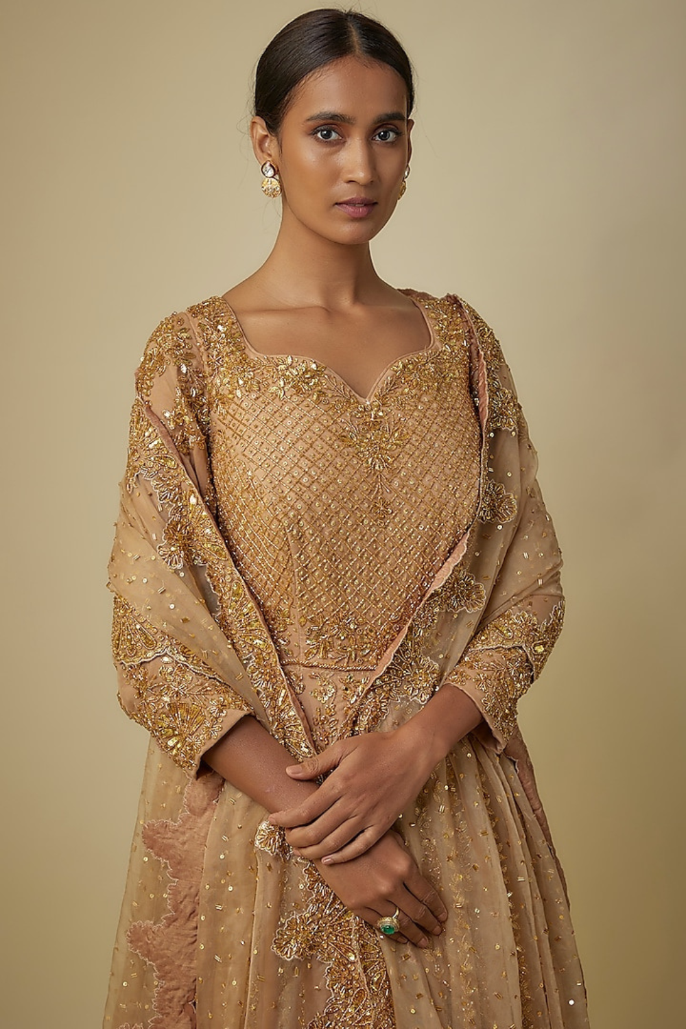 Elevate your wedding look with this exquisite Gold Jacket, Lehenga, and Dupatta Set. The intricately embroidered organza jacket, featuring a center-front open design, pairs gracefully with a dainty raw silk lehenga and a delicate organza dupatta. Adorned with intricate cutwork embroidery on all three pieces, this ensemble is a perfect blend of opulence and elegance—ideal for brides or their mothers.