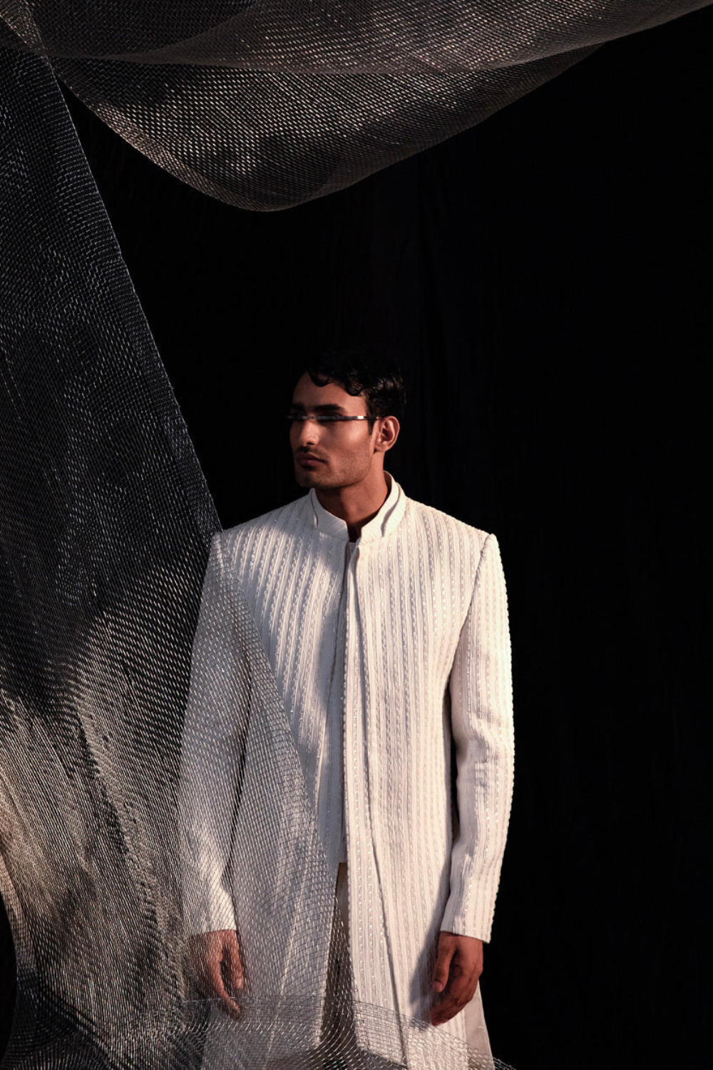 Featuring signature cut self pleate ind-western with acryalic sequence and pearl work