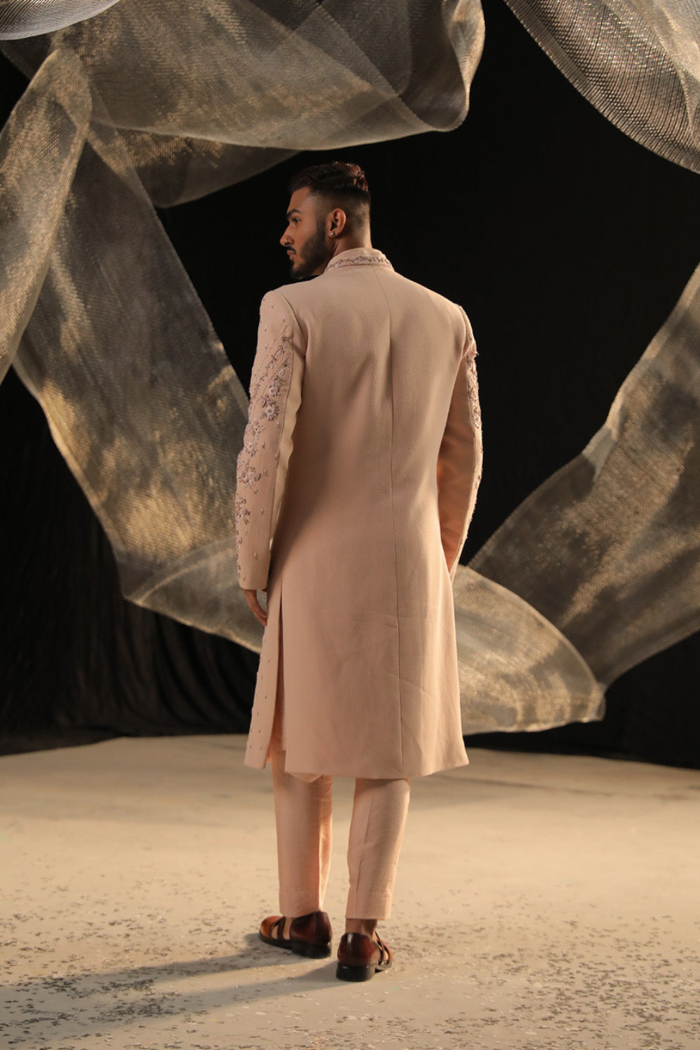 Cameo Pink Crape Sherwani With Dabka And Resham Work Embelished With Brass Work