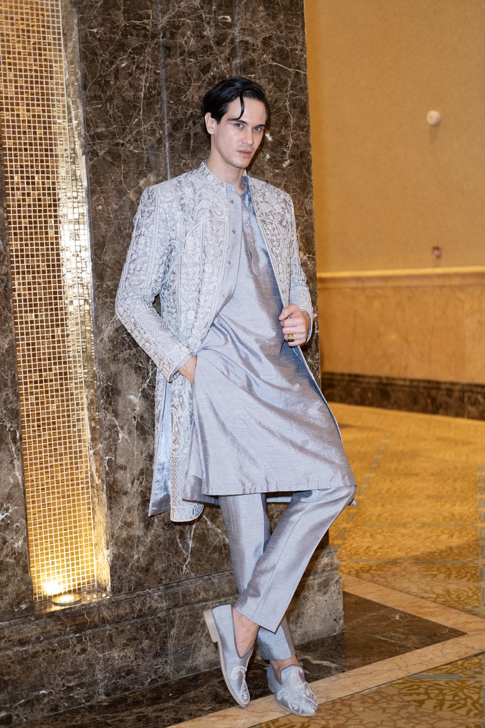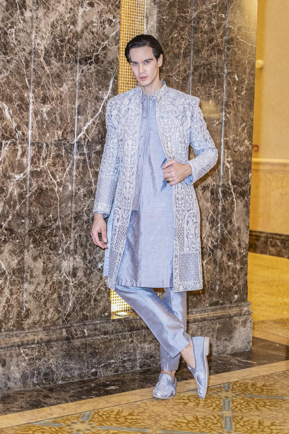 Lilac grey sherwani set, designed for the discerning gentleman. this luxurious ensemble includes a kurta, pants, and a sherwani, all crafted from vegan raw silk in a soothing lilac grey shade. the sherwani boasts intricate ash-white embroidery, featuring rich floral and paisley motifs that lend an opulent and sophisticated touch. the detailed craftsmanship creates a stunning contrast against the soft grey fabric, elevating the overall aesthetic to a realm of refined grandeur. the high-quality vegan raw silk ensures comfort while the sophisticated embroidery guarantees you make a memorable impression. embrace a look of regal distinction with this exquisite sherwani set, where every stitch reflects artistry and elegance.