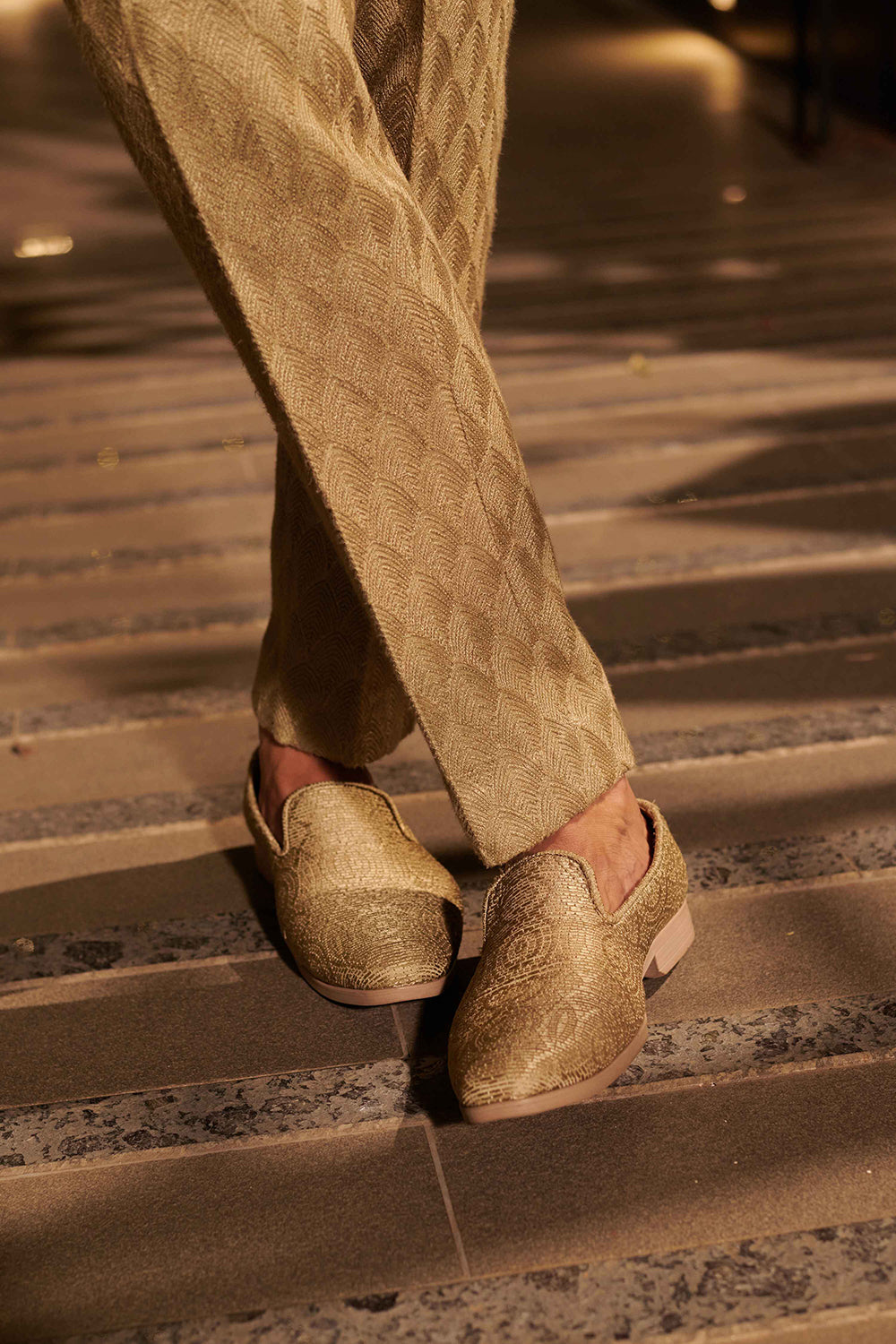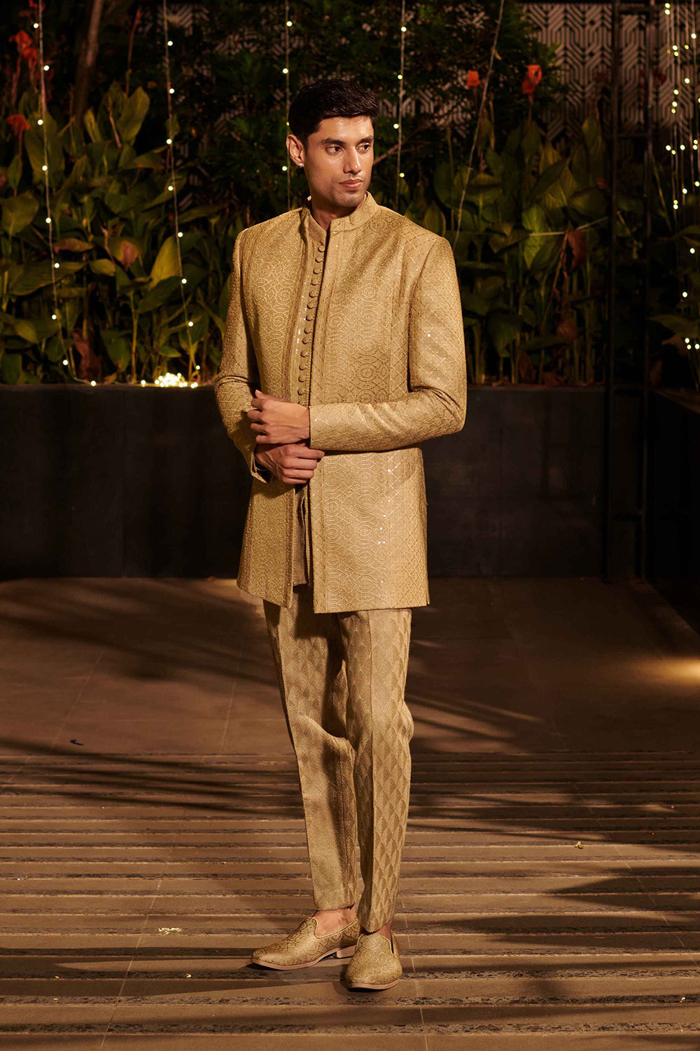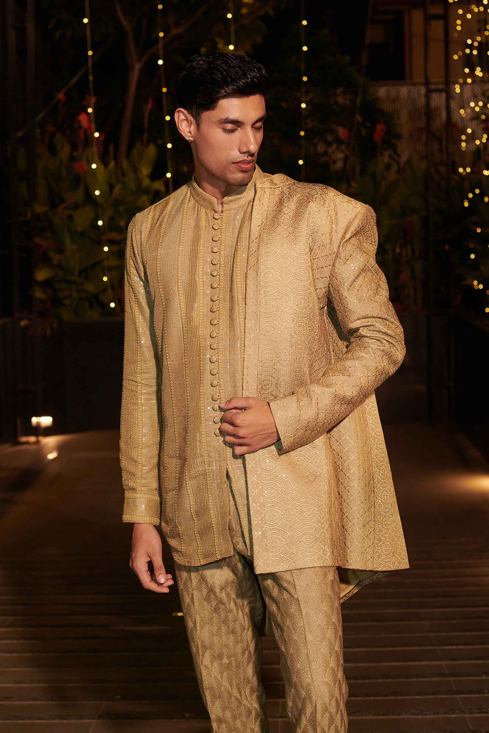 Make a refined statement with this men’s ensemble in a stunning Endive Green hue. Crafted with intricate hand-thread work that adorns the entire outfit, every stitch exudes artisanal craftsmanship and attention to detail. The short jacket features an open-front design with a sleek standing collar, adding a modern touch to a classic silhouette. Paired with tapered pants, this look offers a perfect balance of sophistication and contemporary flair. Ideal for formal gatherings or stylish evening events, this outfit ensures both comfort and elegance, offering a sharp, tailored fit that effortlessly combines tradition with innovation. Perfect for the fashion-conscious man seeking an elevated, unique style.