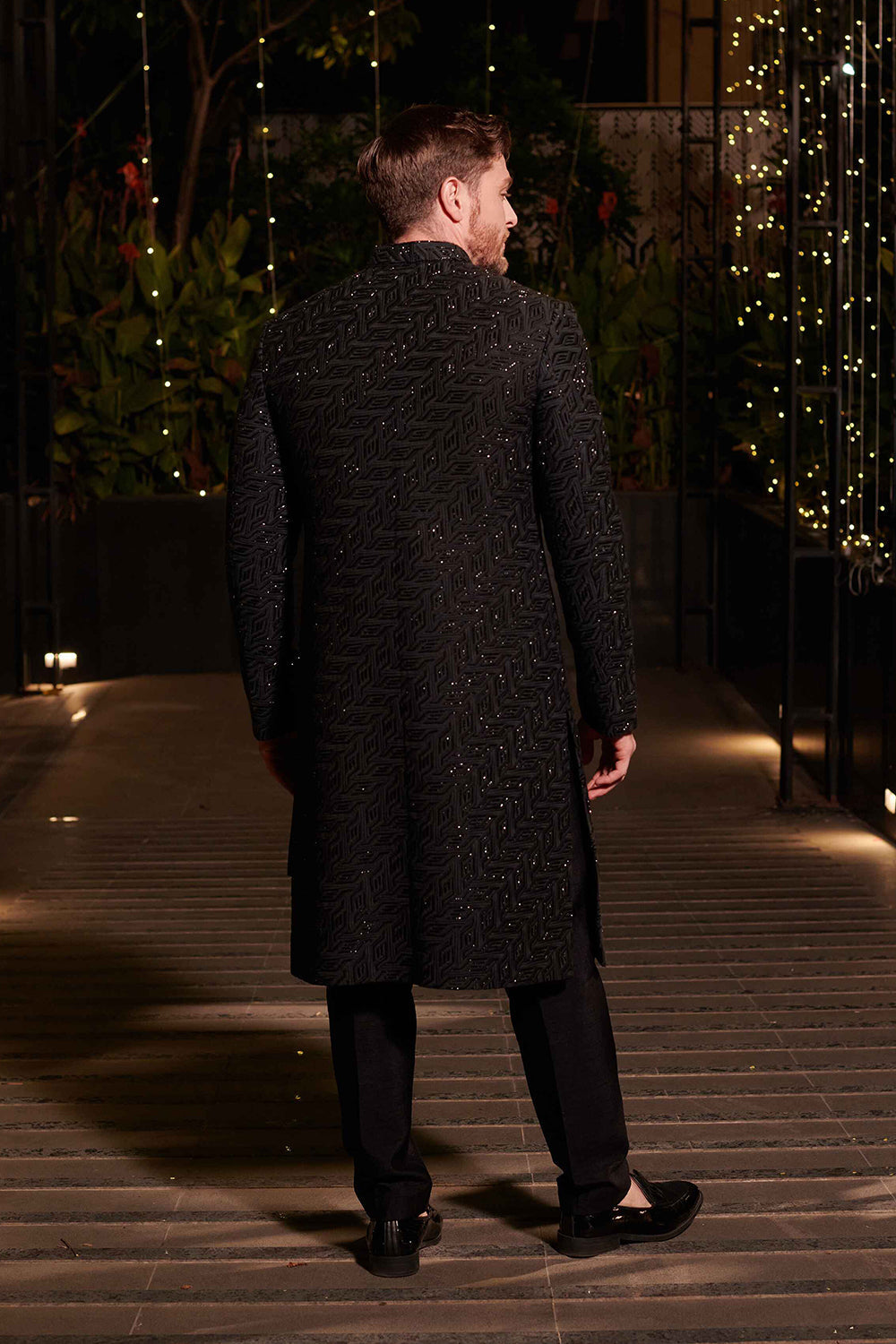 Make a bold statement with this refined Bandhgala Sherwani Set, designed to elevate your festive wardrobe. The jacket is crafted from luxurious georgette fabric, featuring intricate thread embroidery all over, beautifully enhanced with kut dana embellishments for a touch of sparkle and texture. Its sharp, tailored silhouette exudes modern sophistication, while maintaining traditional appeal. The set includes a plain kurta and pants made from breathable linen fabric, offering both comfort and style. Perfect for weddings, receptions, or any formal occasion, this Bandhgala Sherwani Set effortlessly blends timeless craftsmanship with contemporary design. A true showstopper for the discerning gentleman seeking elegance and grace.