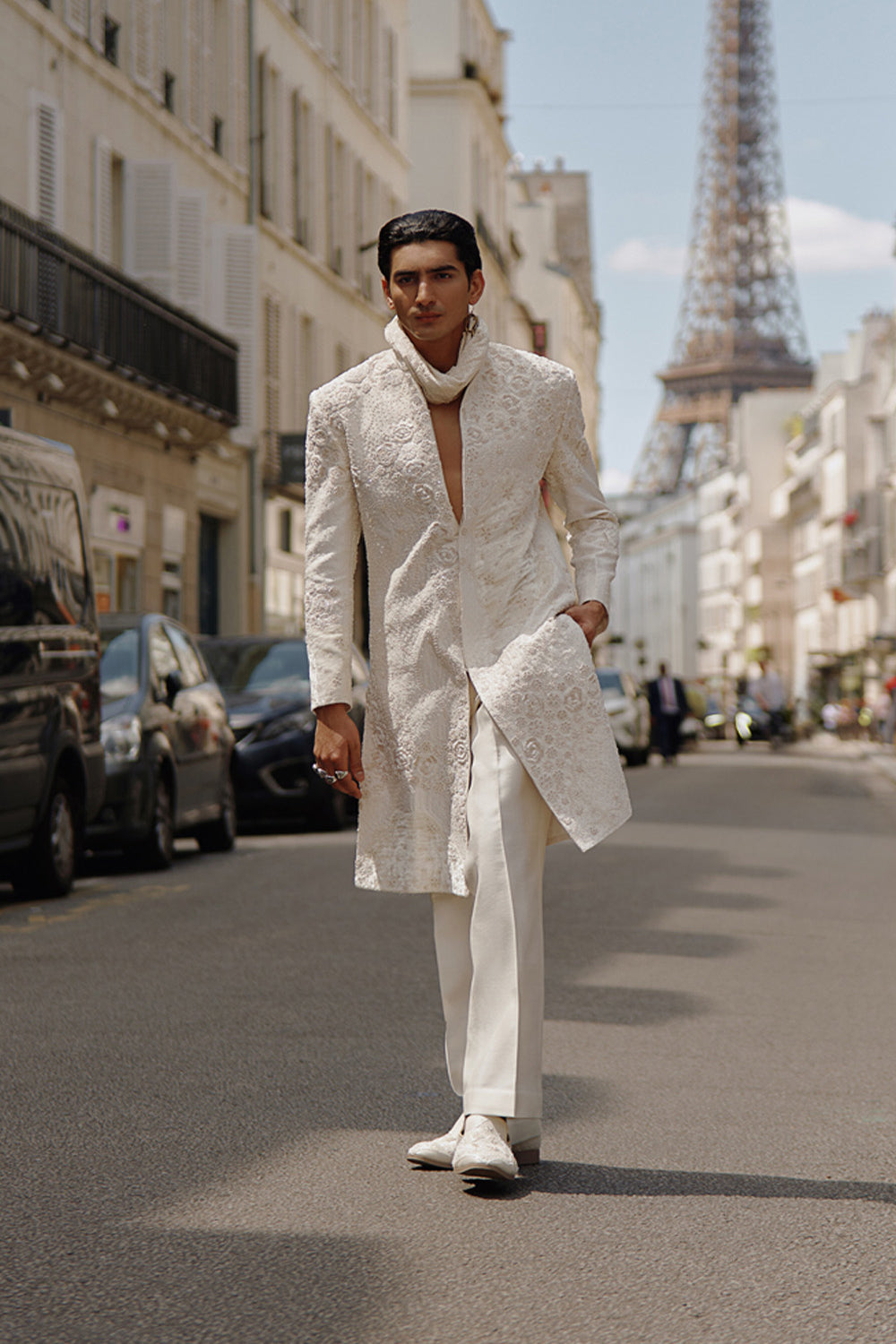White sherwani set, featuring intricate handwork embroidery and monochromatic velvet patchwork. crafted from raw silk and velvet, the sherwani pairs elegantly with a chanderi silk kurta and pant. complete your ensemble with a luxurious linen satin dupatta