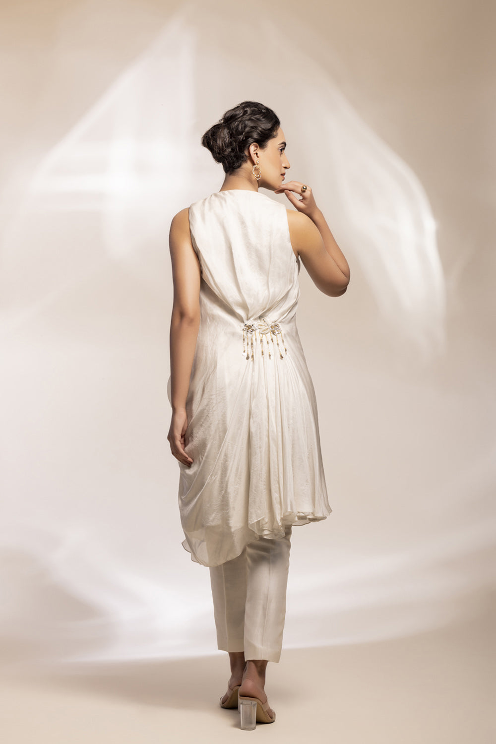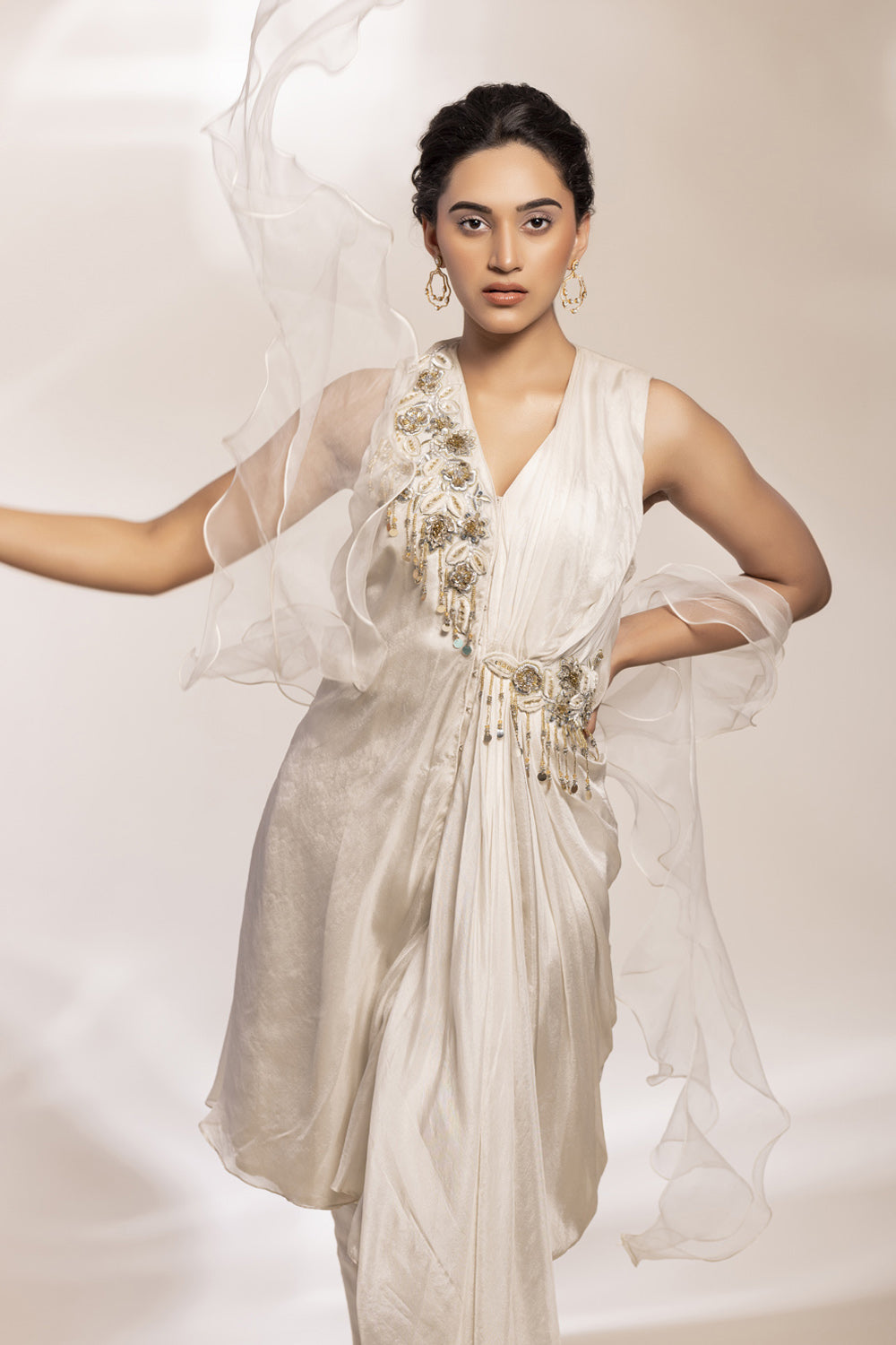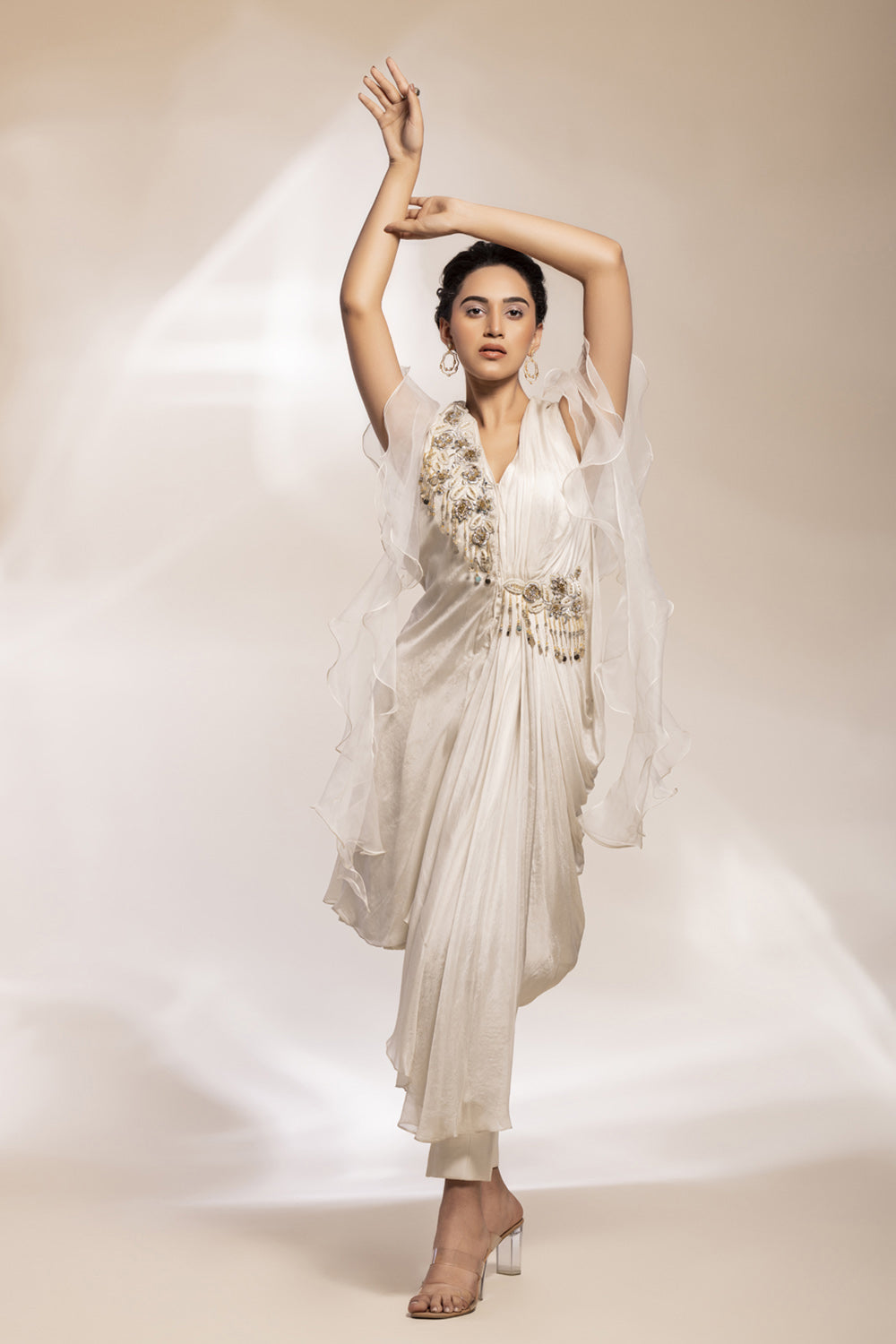 This is a beautiful off-white chiffon shirt draped in an elegant manner. The shirt is adorned