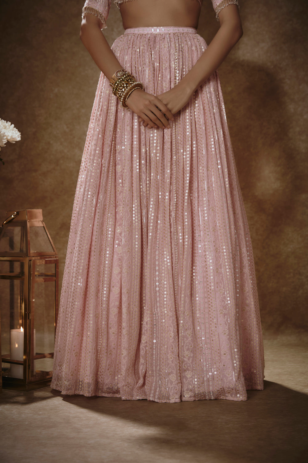 This look features a blush pink sequin and floral threadwork lehenga set. the ensemble has a sweetheart neckline blouse, with back cutout. it is teamed with a matching flowy lehenga. a mint net dupatta with sequin, cutdana & mirror embroidered border completes the look. cancan & pockets are included