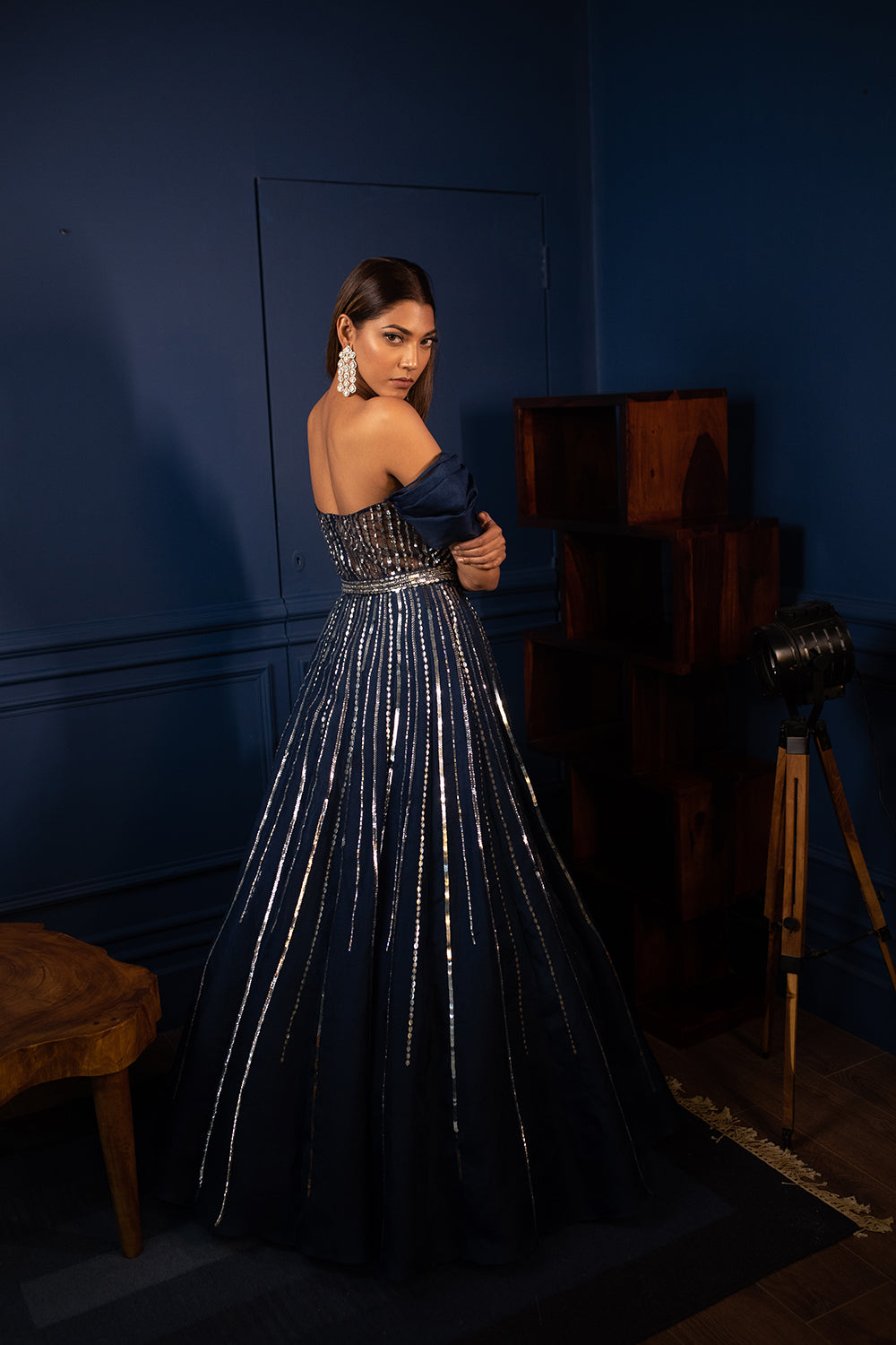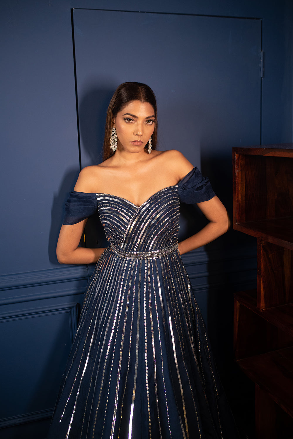 Asteroid cocktail gown , fine geometric detailing on organza done with crystals and sequins.