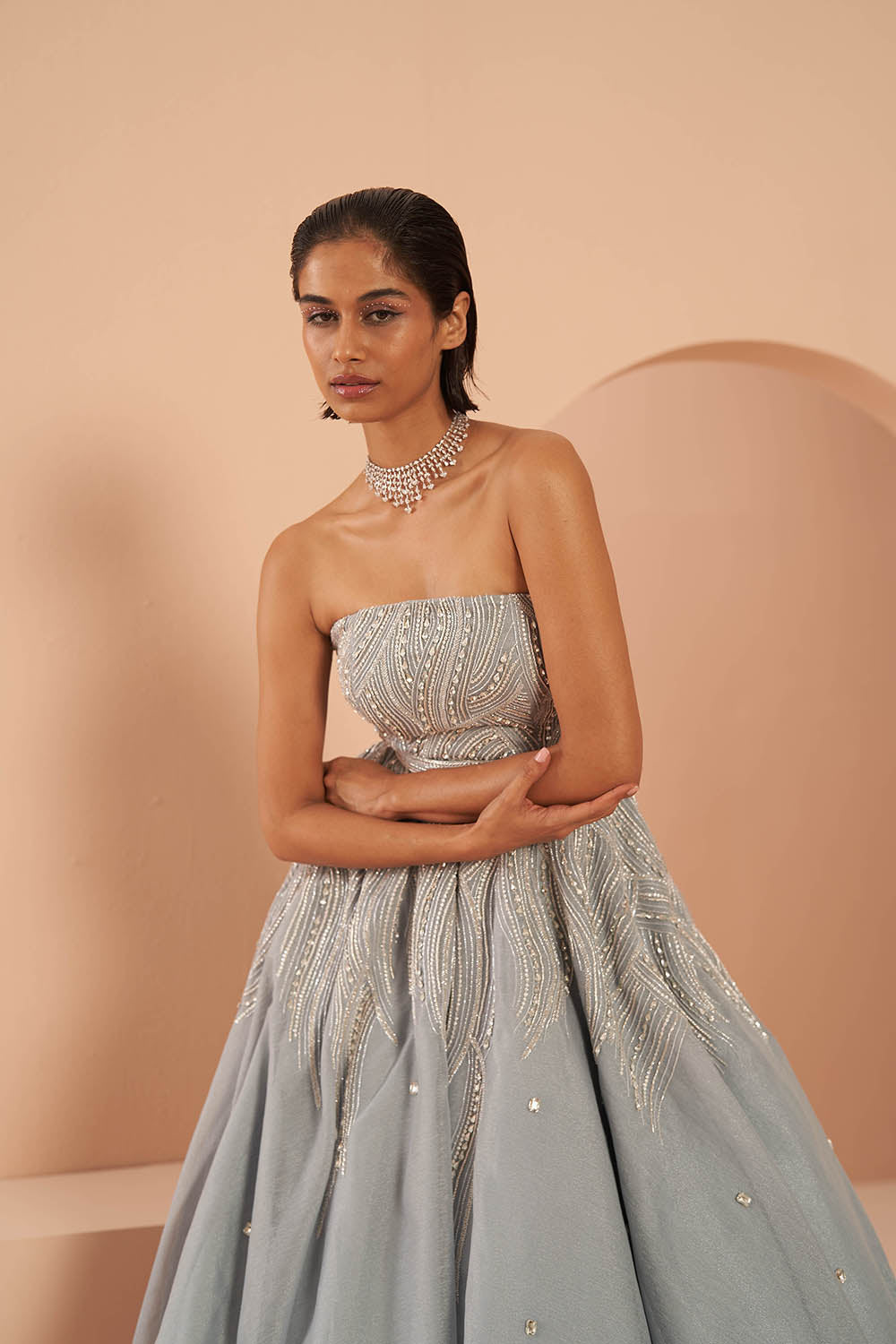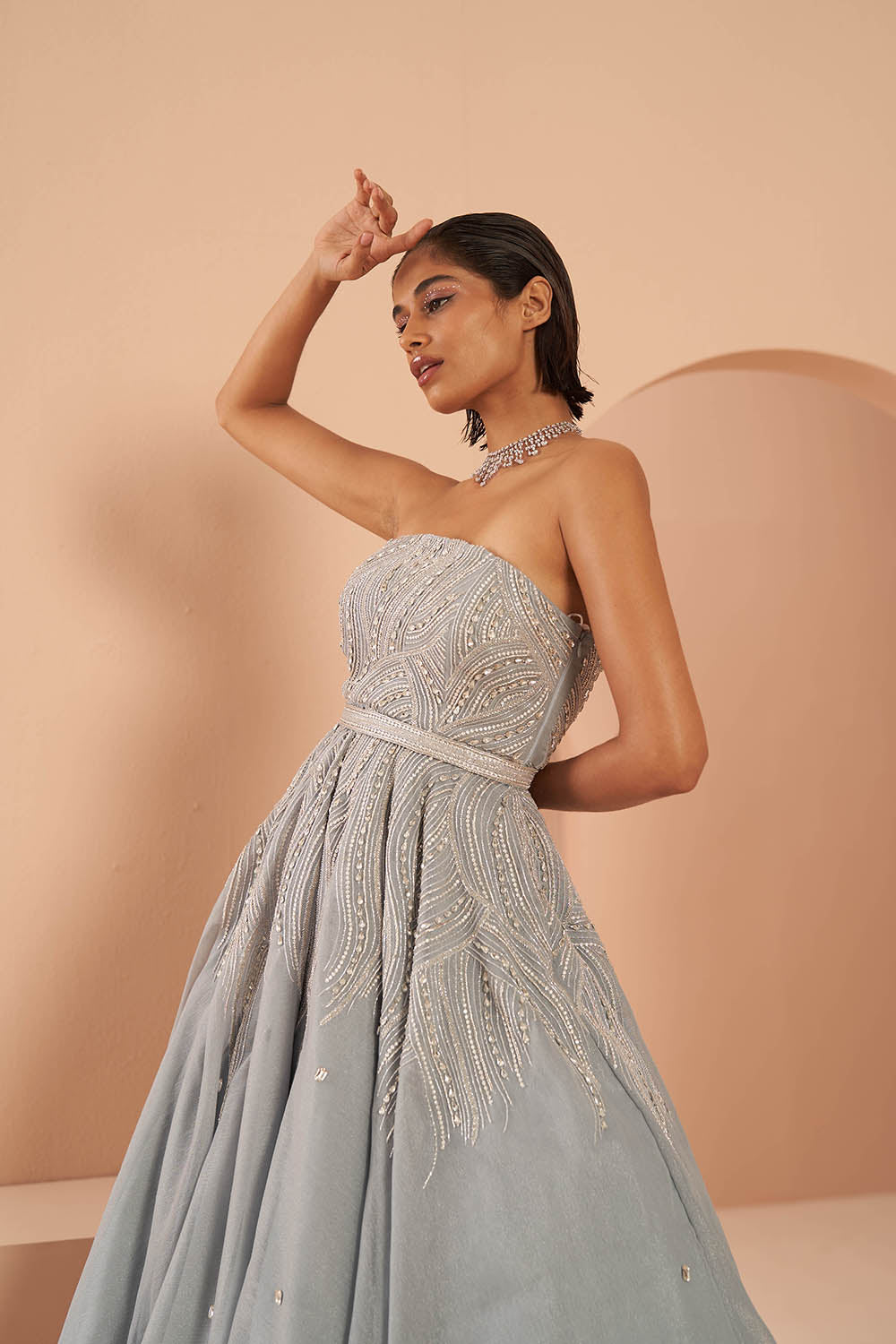 A bold and classic silhouette ,having intricate linear detailing with stones and glass beads