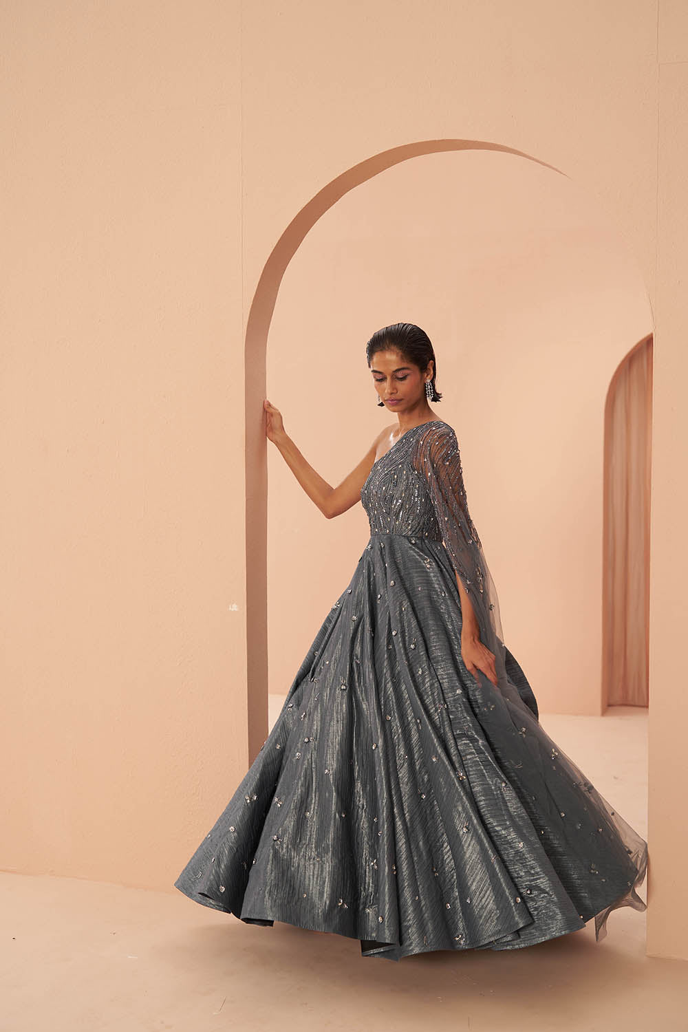 A stunning one shoulder gown featuring a metallic crushed organza, heavily embellished torso with stones and sequins