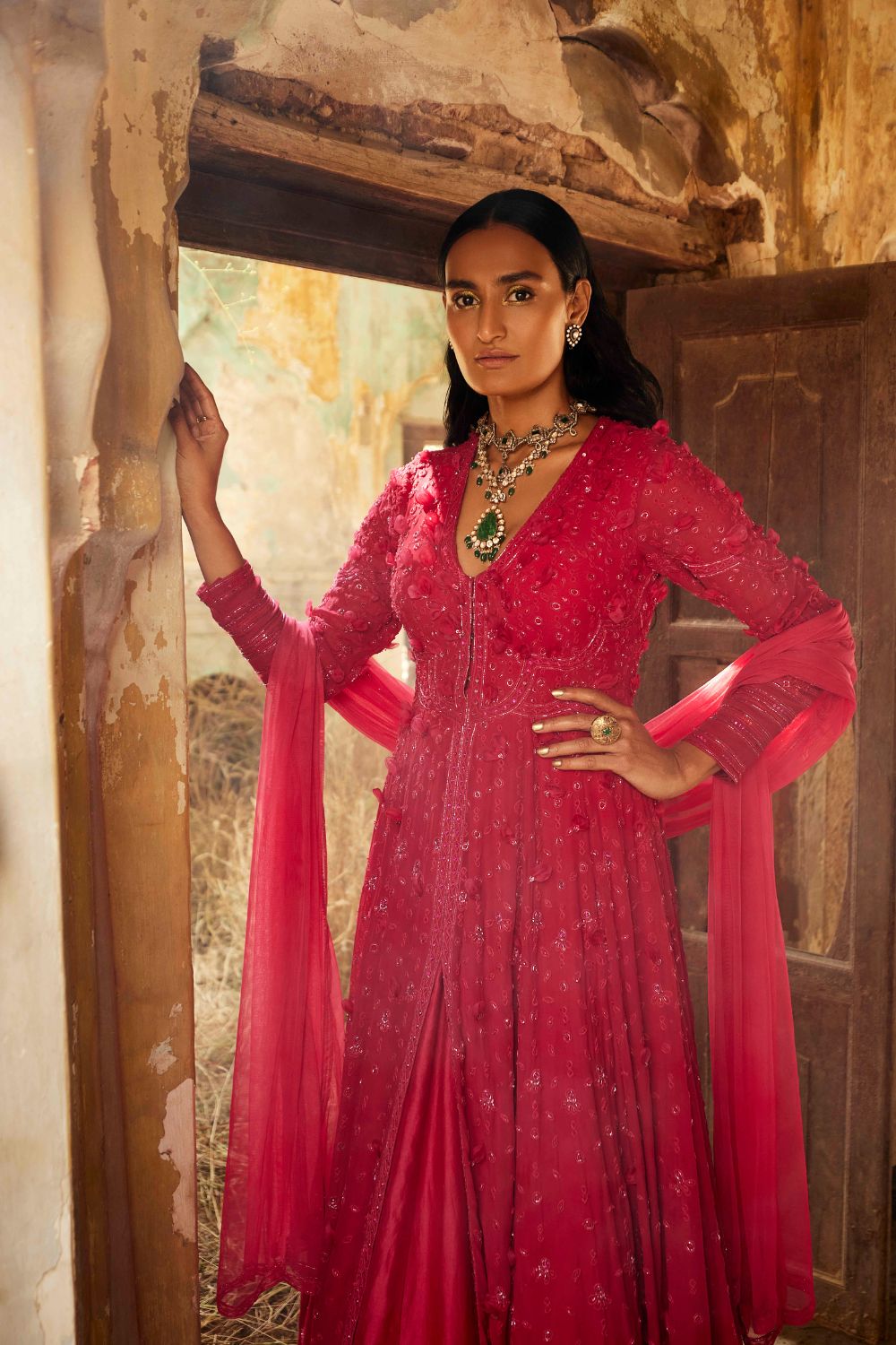 Fuchsia Georgette Embroidered Long Anarkali With Net Embroidered Dupatta