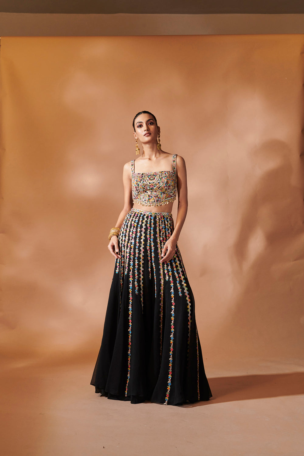 Black georgette high waist sharara paired with a short blouse with embroidery