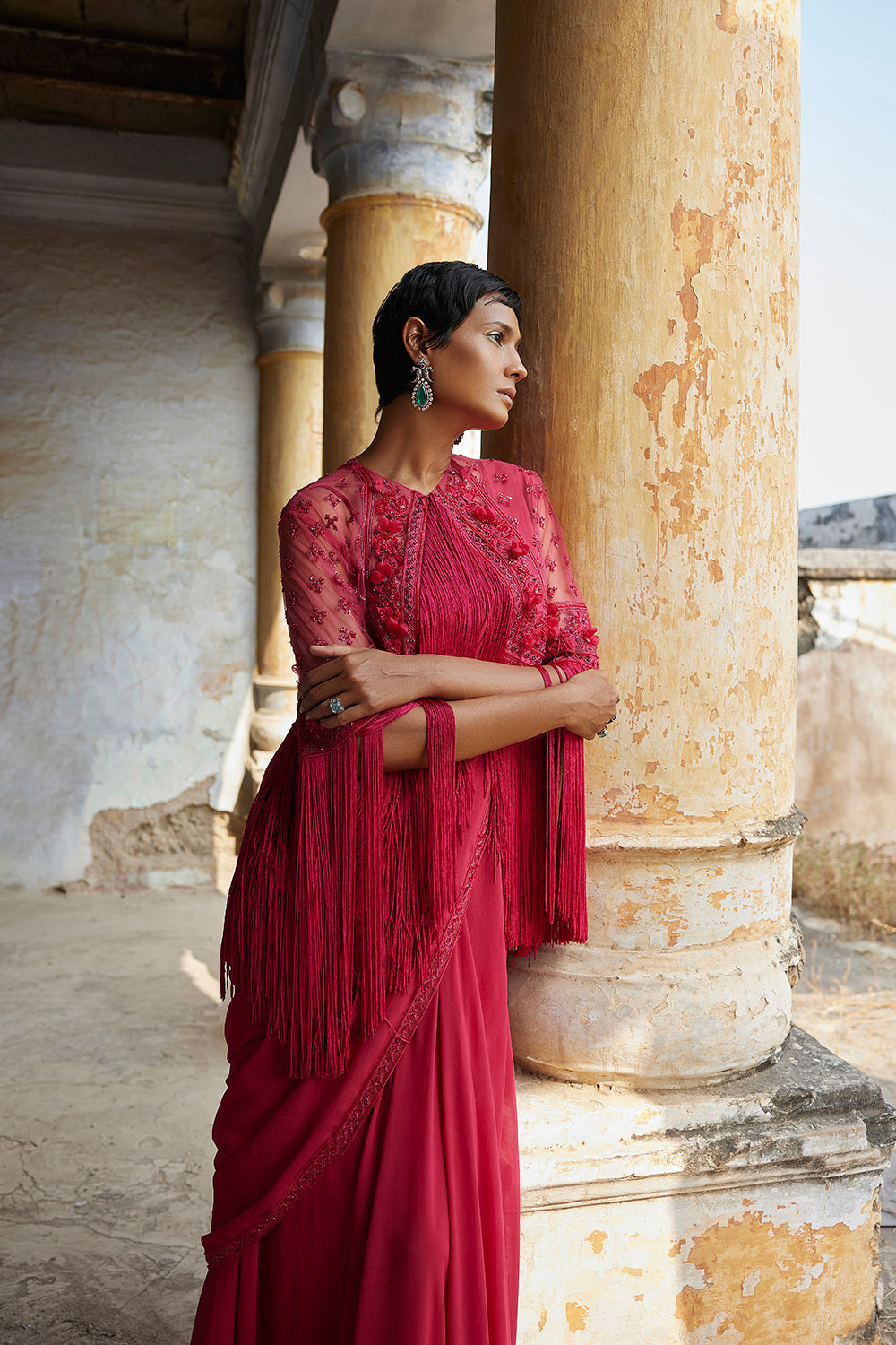Fuchsia Georgette Saree With Embroidered Border And Georgette Sleeveless Plain Blouse Paired With Embroidered Fringed Cape
