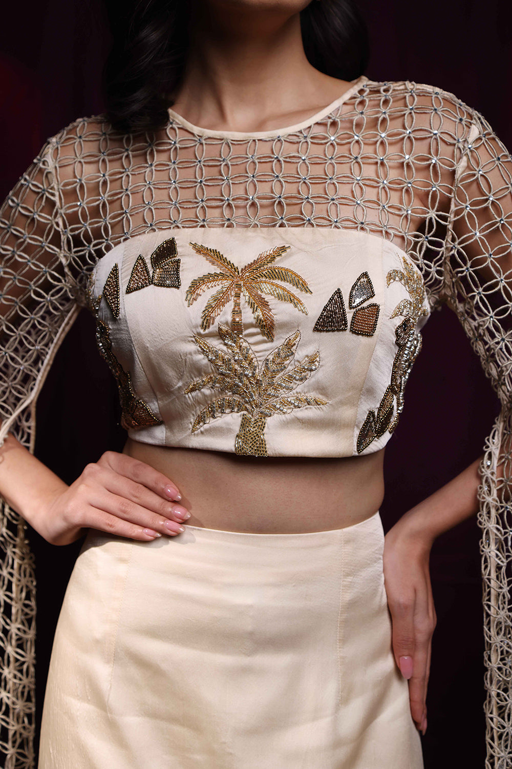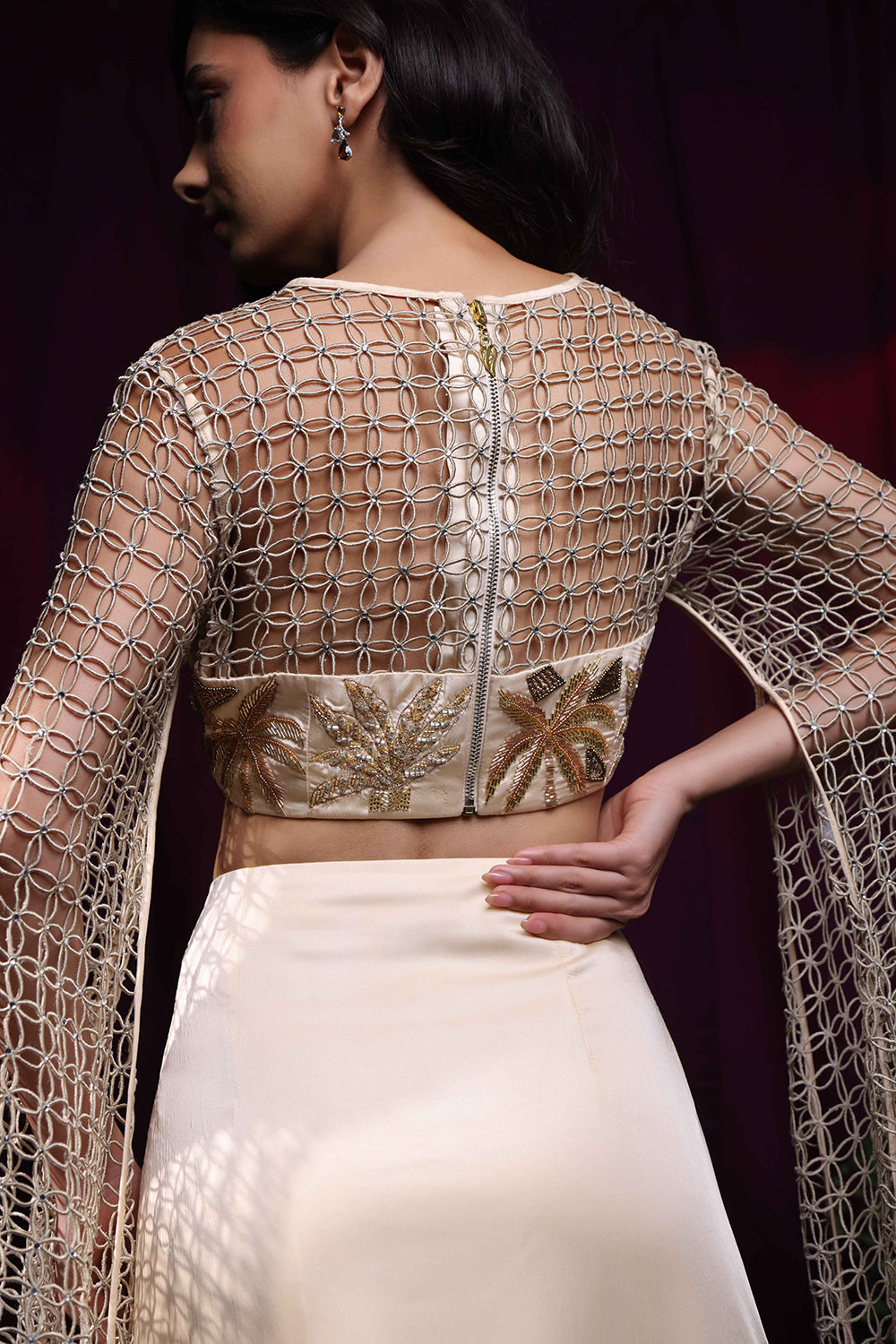 Laser cut styled drapedsleeve blouse and lehenga set