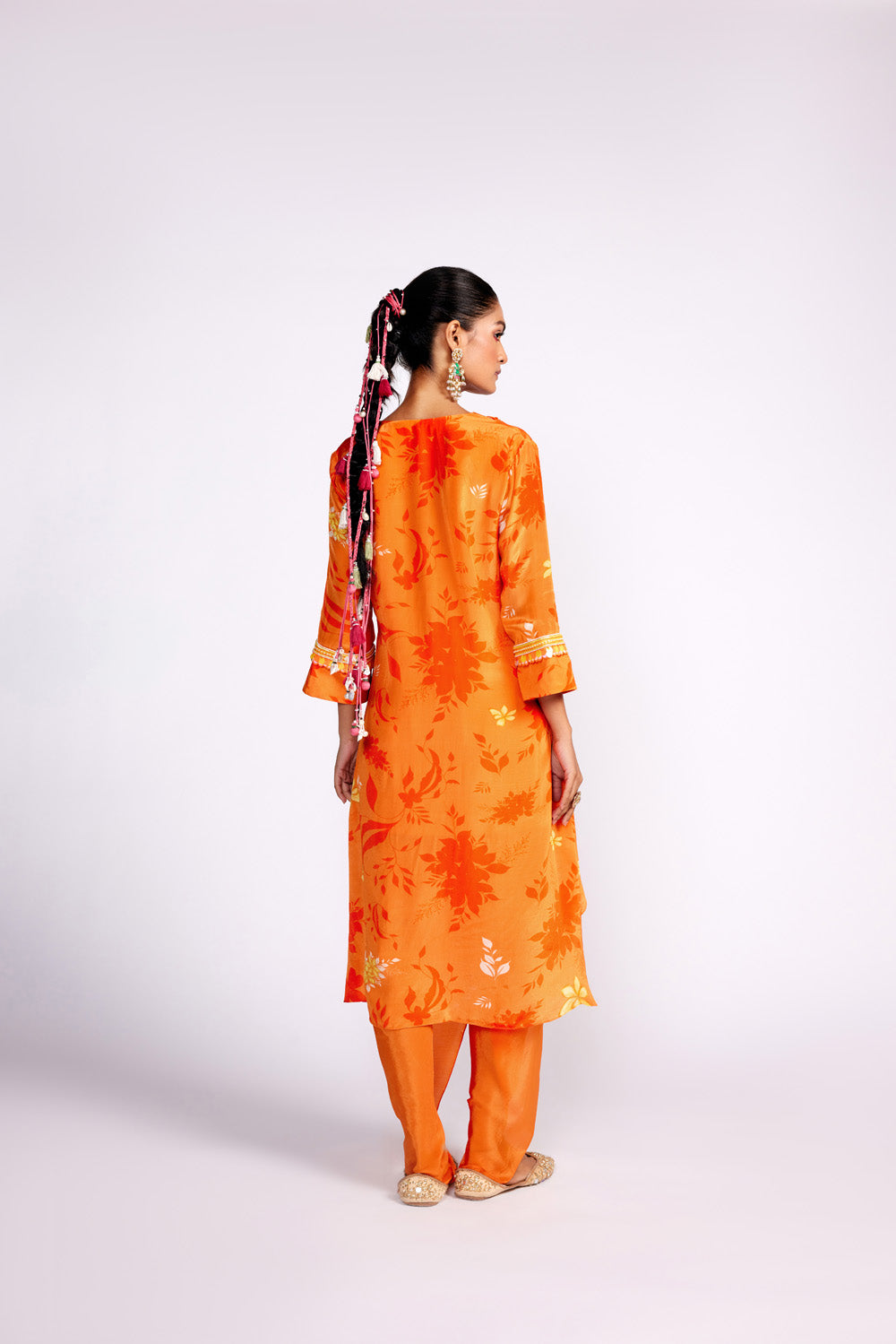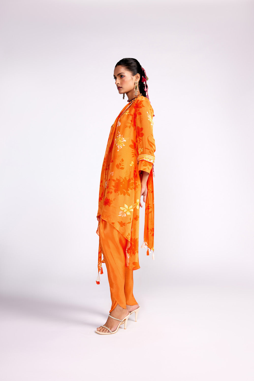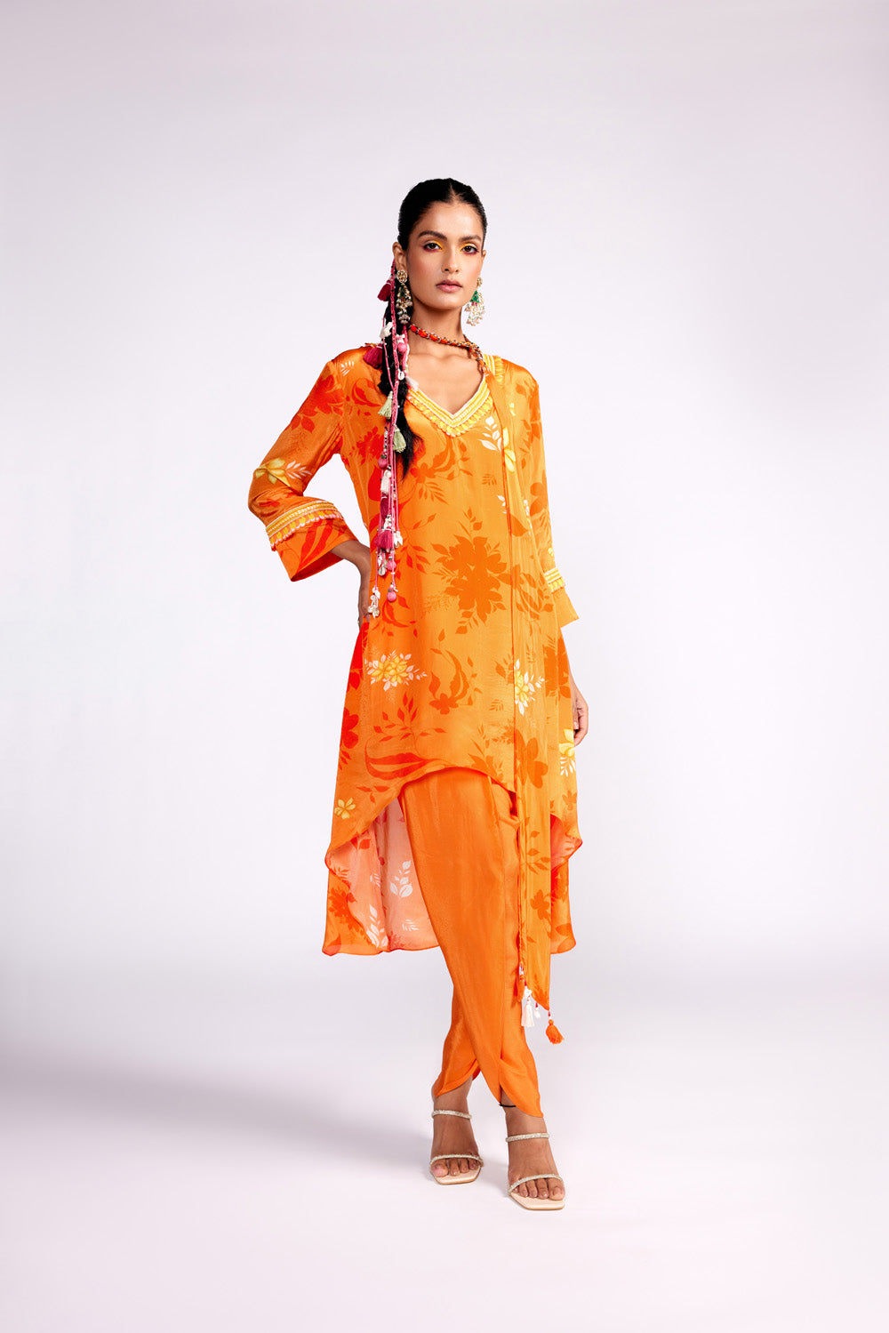 Featured here is asssymetric hem printed kurta paired with tulip pants