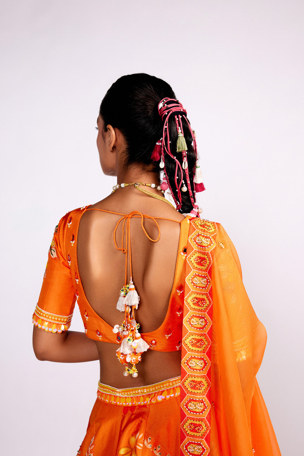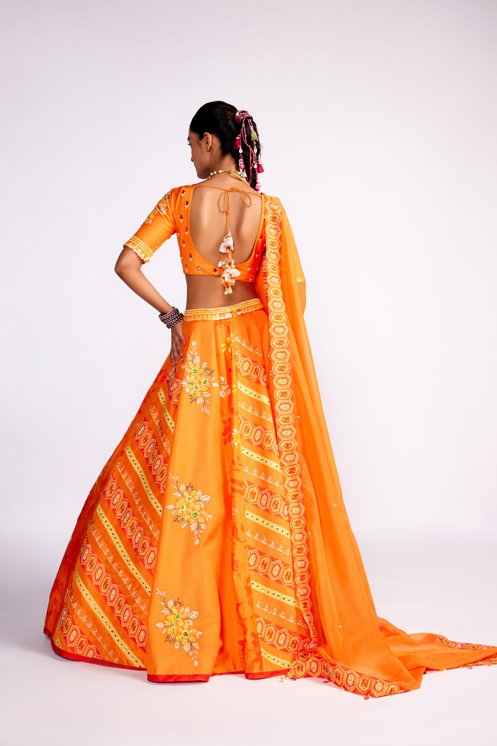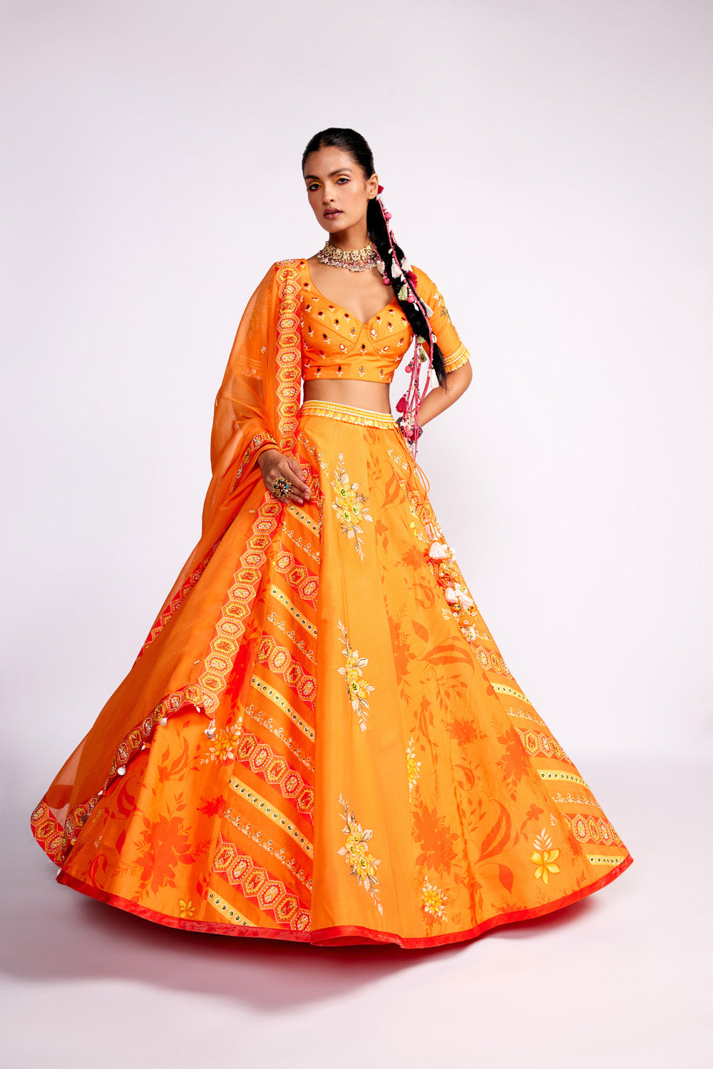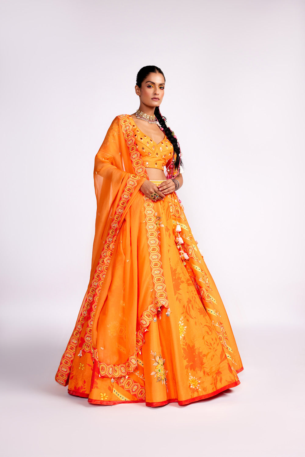 Tangerine Orange Printed And Embroidered Silk Lehenga Set