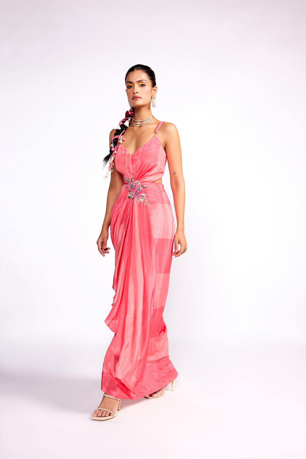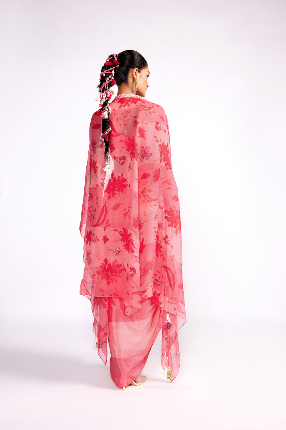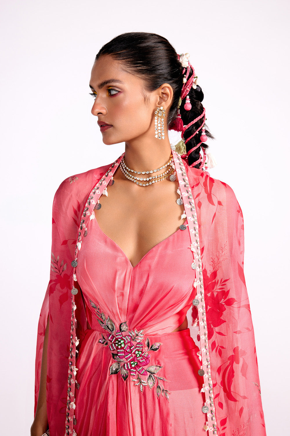 made in crepe with a 3d embroidered floral motif placed on waist. it is paired with an embroidered organza cape to complete the look.