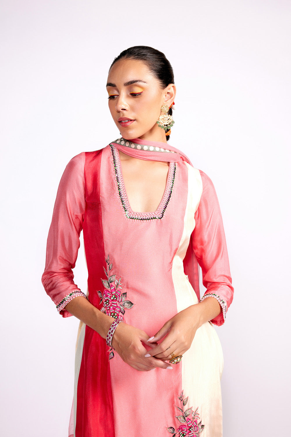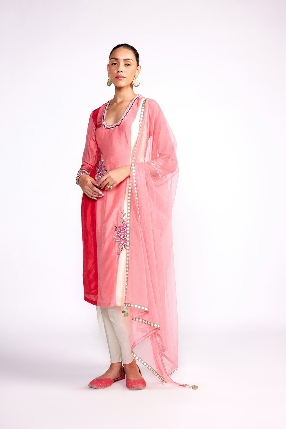 the kurta features 3d embroidered florals. it is paired with tulip