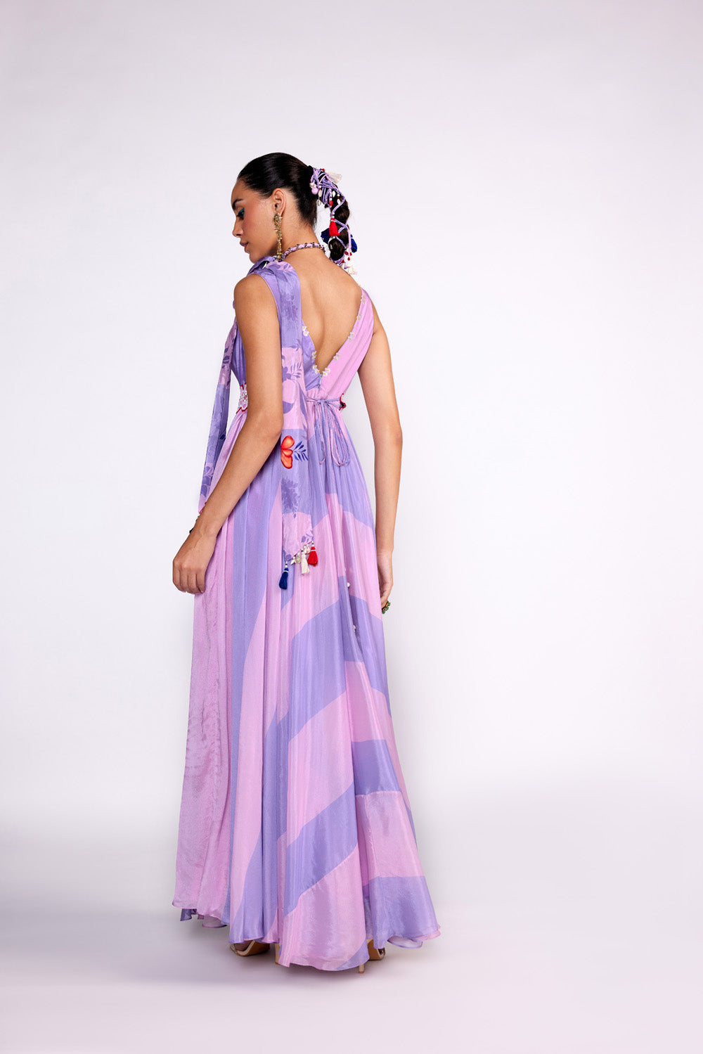 This set features a lilac color block anarkali gown made in chiffon. it is paired with an embroidered cut work belt and dupatta style scarf to complete the look.
