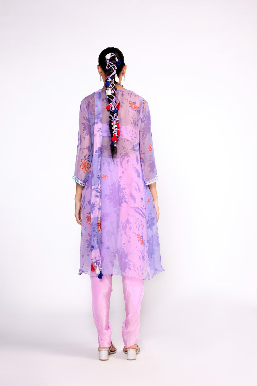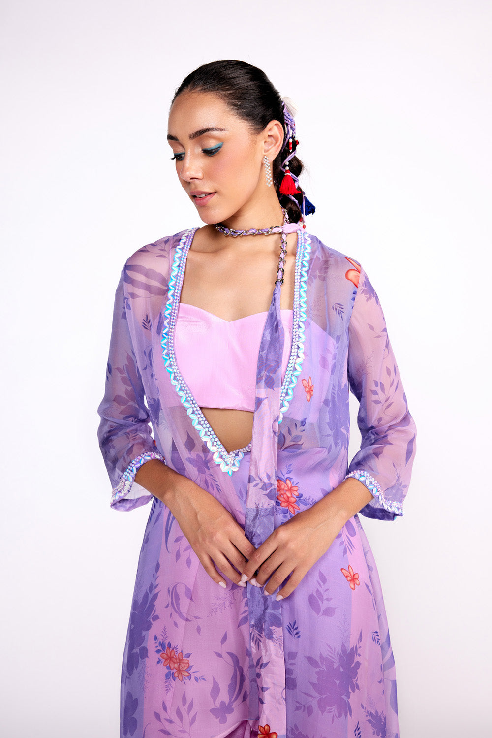 This set features a printed organza tunic with embroidered neckline and sleeves. it is paired with a silk bustier and tulip pants made in crepe.