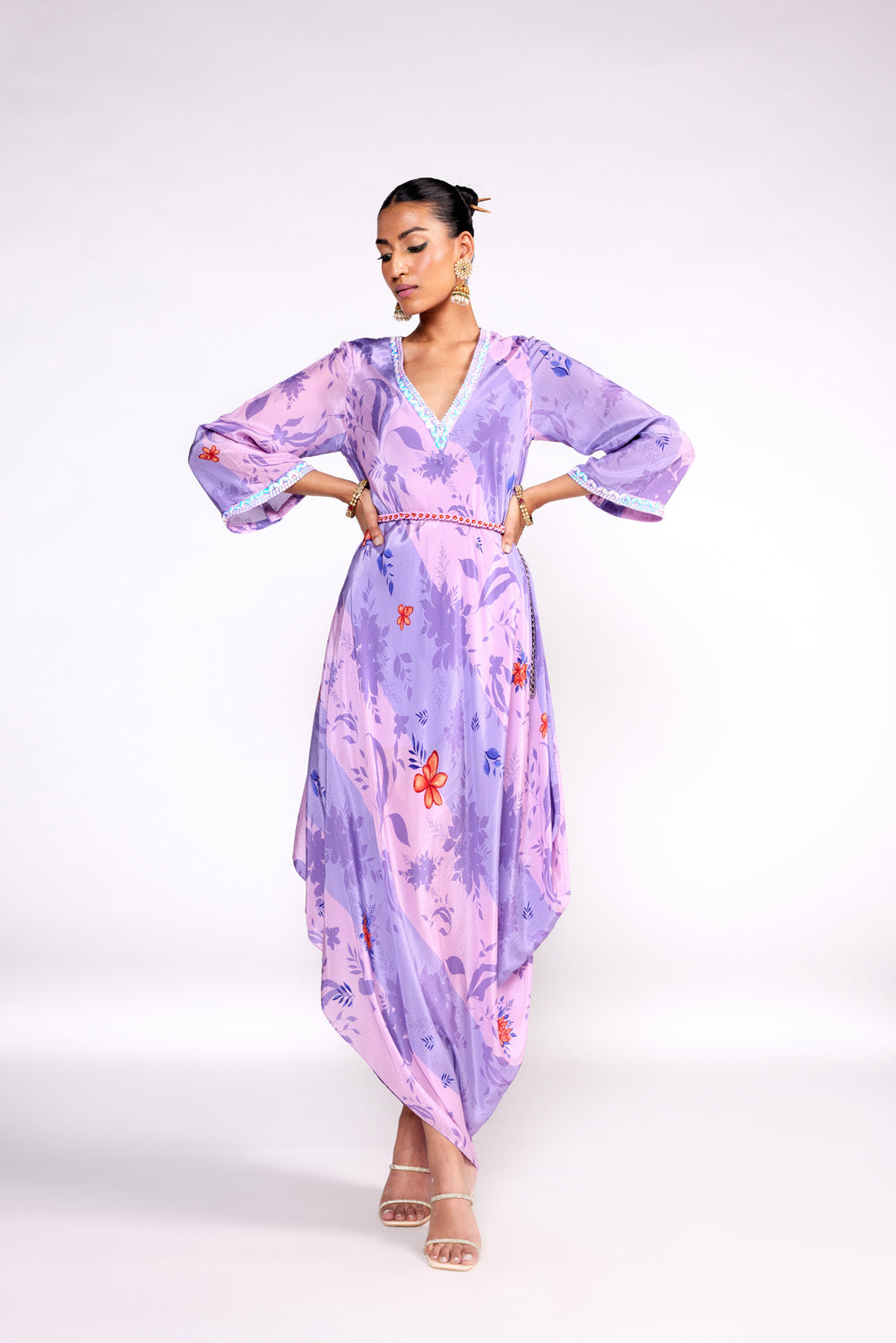 neckline and sleeves. it is paired with an encrusted macrame belt to complete the look.