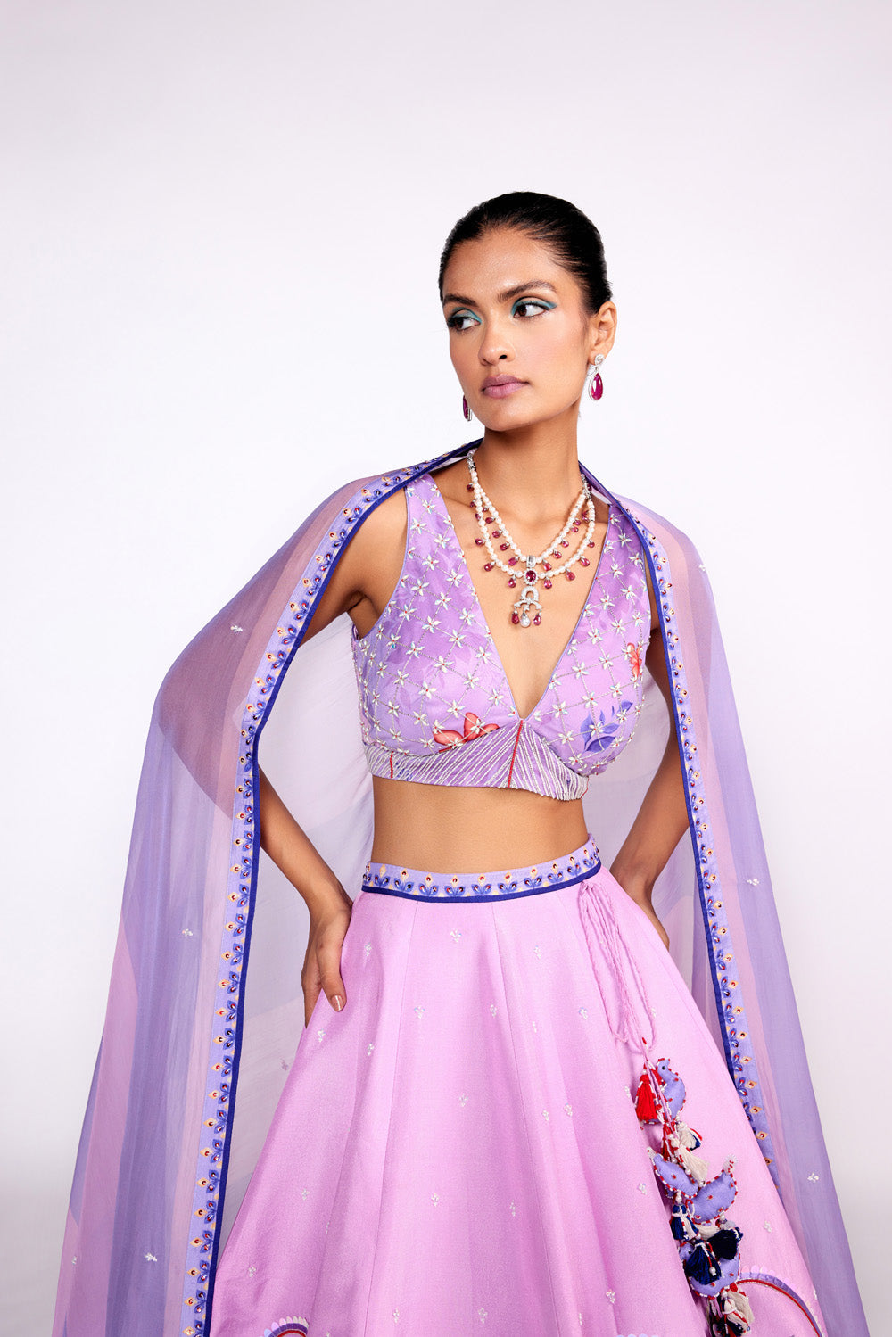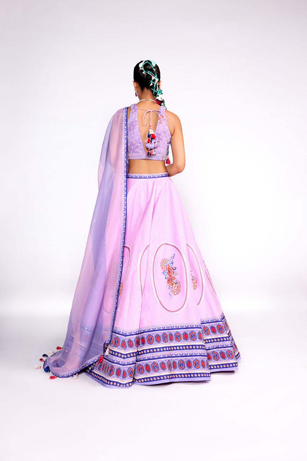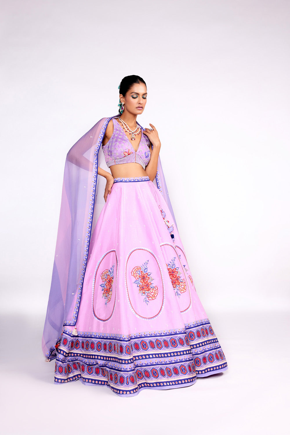 Featured here is lilac embroidered kalidaar lehenga made in silk.