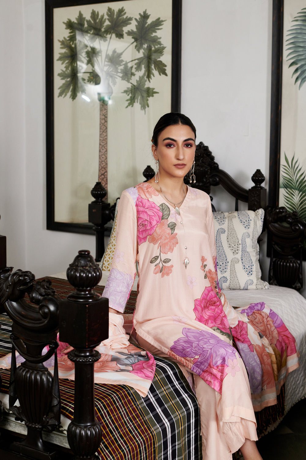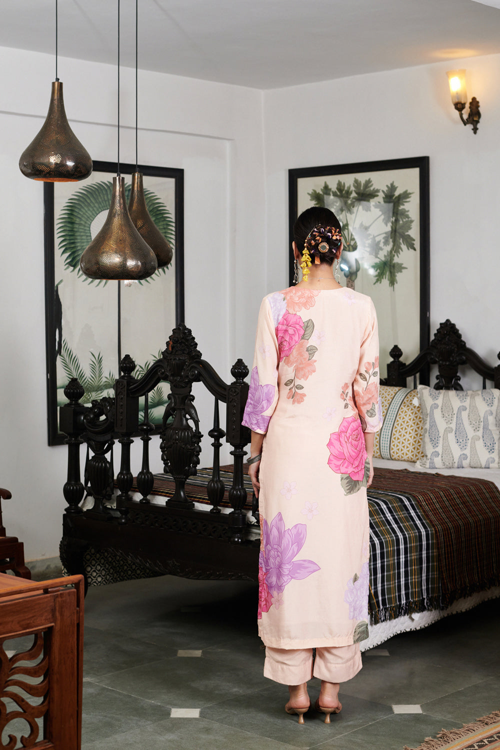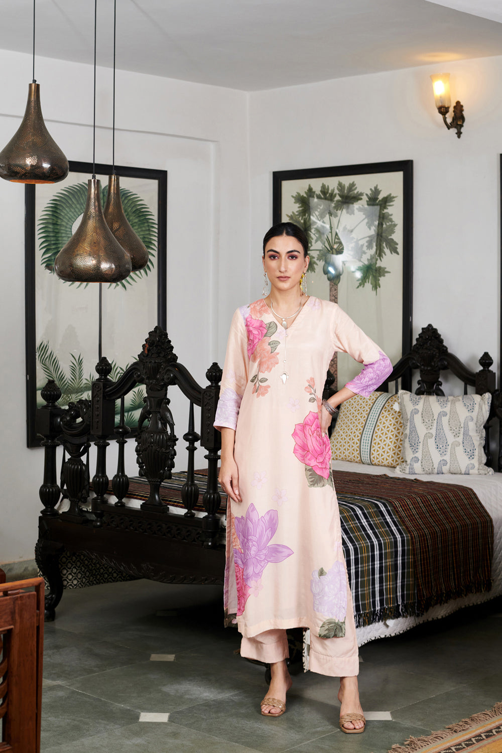 Nude beige big flower digital printed kurta with solid colour pants comes with printed dupatta in cotton silk. (no linning in pant)