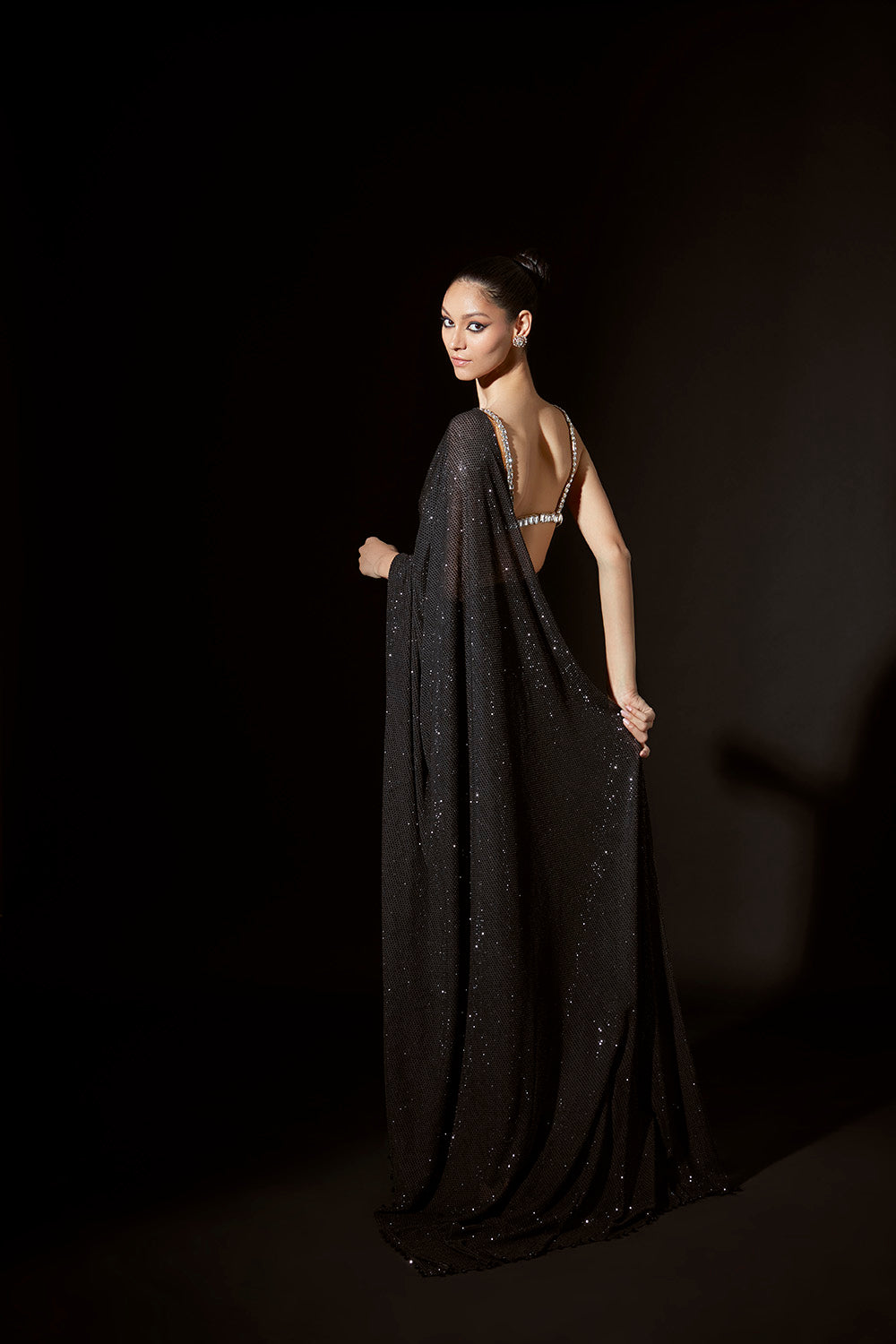 Black crystal embellished prestitched saree paired with a silver blouse featuring striking big stones.