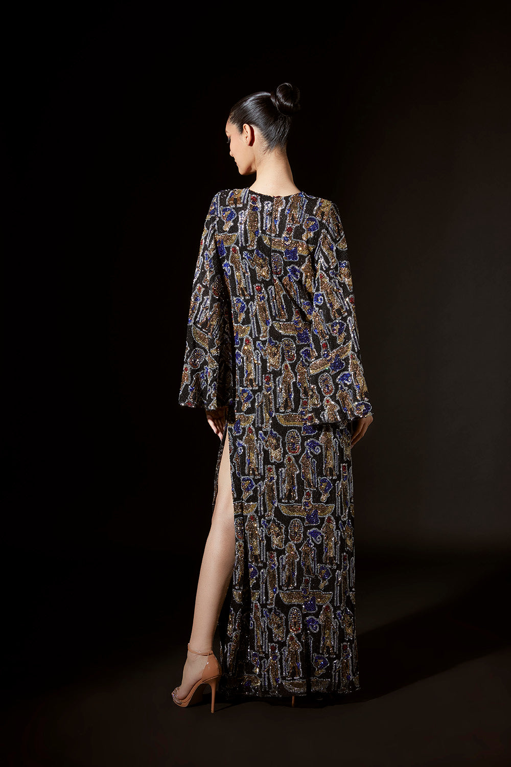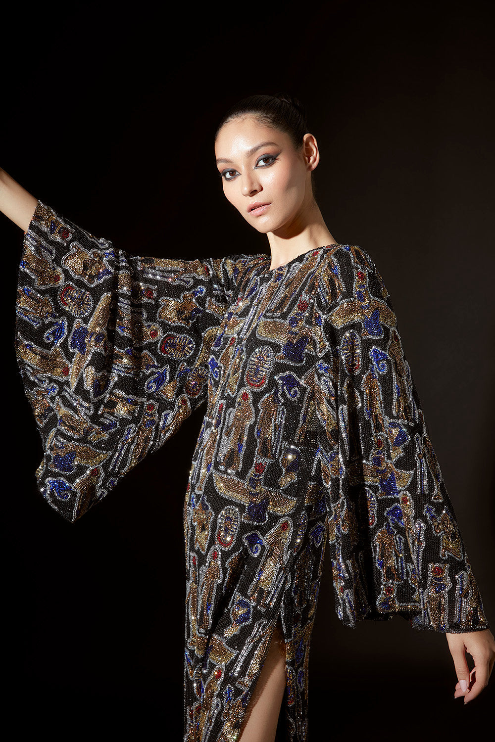 Indulge in the epitome of luxury and glamour with this exquisite kaftan dress. crafted with meticulous attention to detail, the dress features intricate crystal embellishments in the form of figurines, adding a touch of opulence and sophistication.