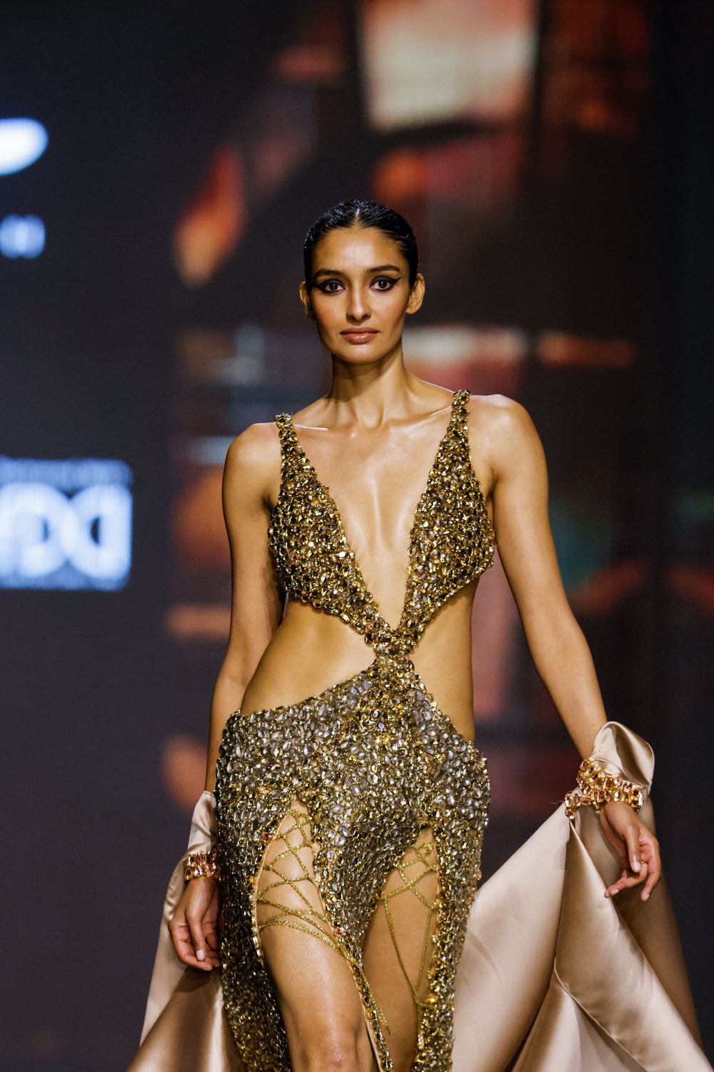 Step into the spotlight with sheer radiance in this peach ombre big crystal cutout gown featuring a plunging neckline. adorned with bold crystals that catch the light with every movement, this gown exudes glamour and sophistication. the daring cutout details add a touch of allure and modernity, while the plunging neckline accentuates your curves with elegance and grace.